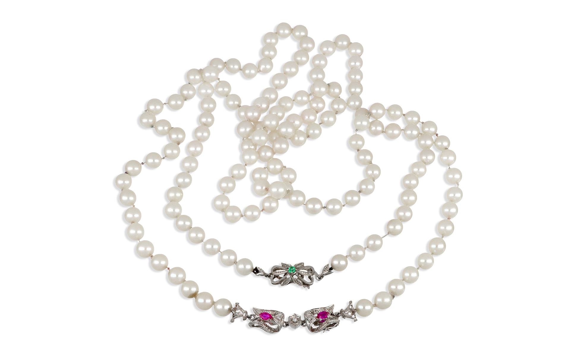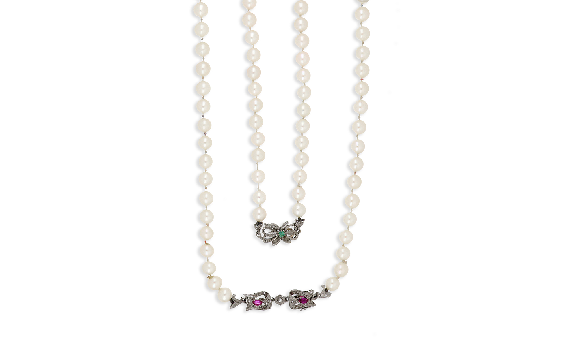 Lotto composto da due collane di perle coltivate giapponesi con chiusura in oro bianco piccoli diamanti a decoro diametro perle di circa 7 30 mm.