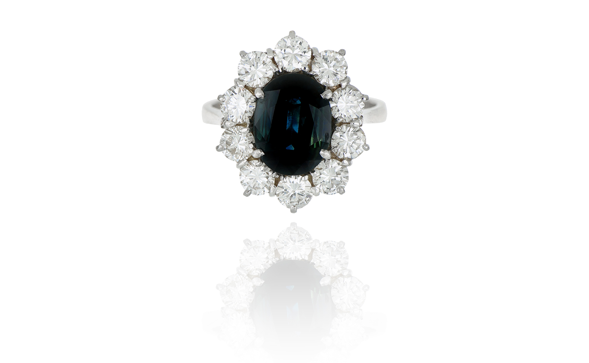 Classico anello a margherita il contorno di diamanti taglio brillante per ct. 2 00 ca. sostiene al centro uno zaffiro taglio ovale di ct. 3 50 ca.