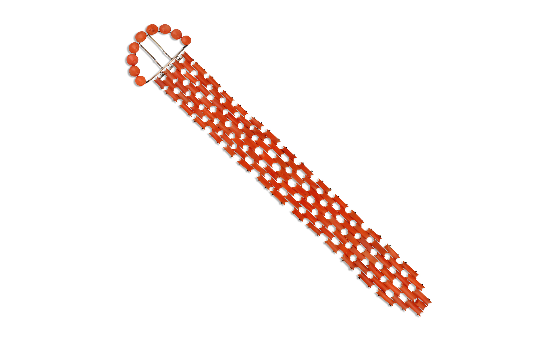 Bracciale a fascia di fine '800 a settori di corallo arancione rosato chiusura a fibbia a doppio artiglio.