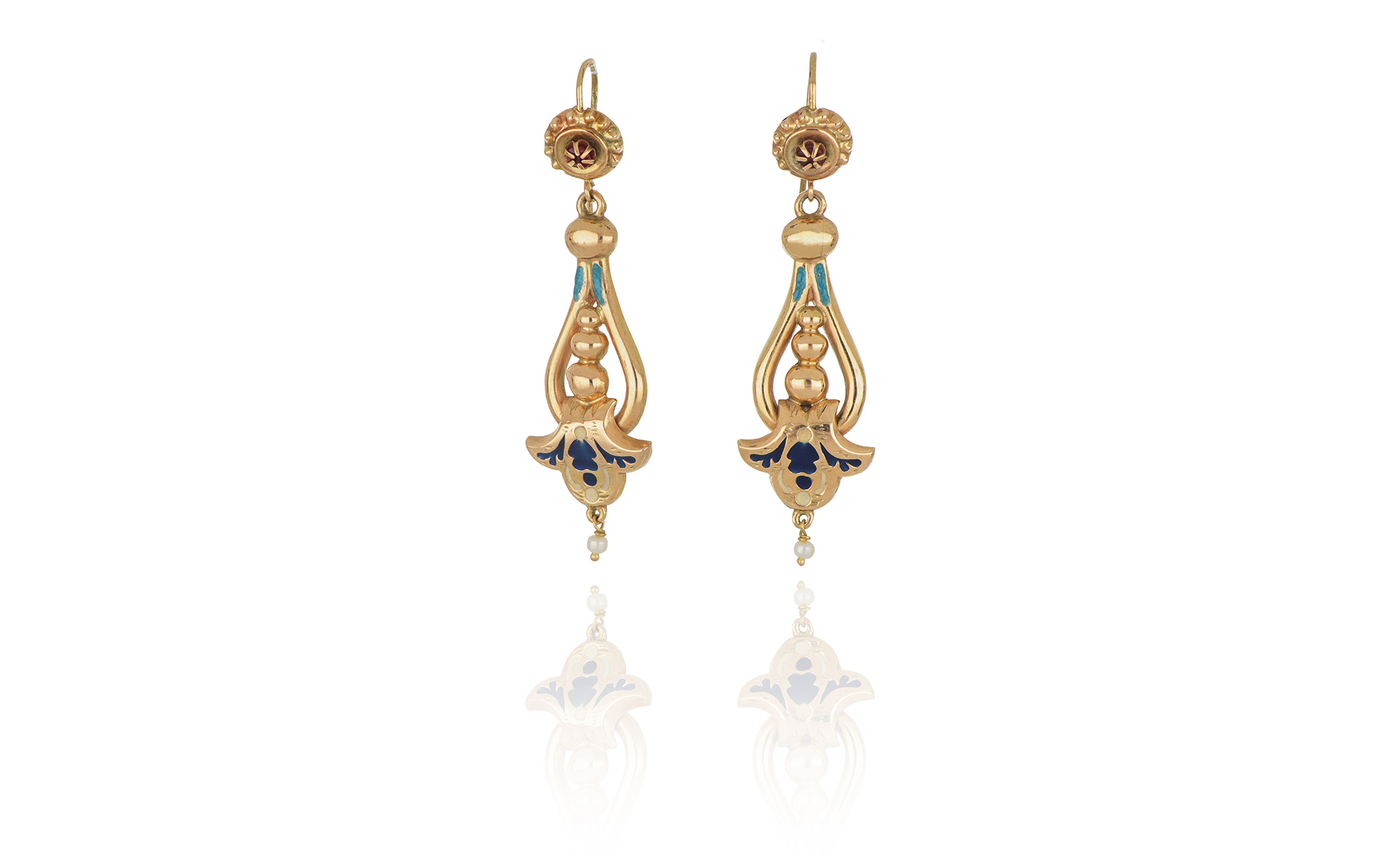 Antichi orecchini borbonici in oro rosso titolo 500/1000 con chiusura amo a lobo smalti e perline.