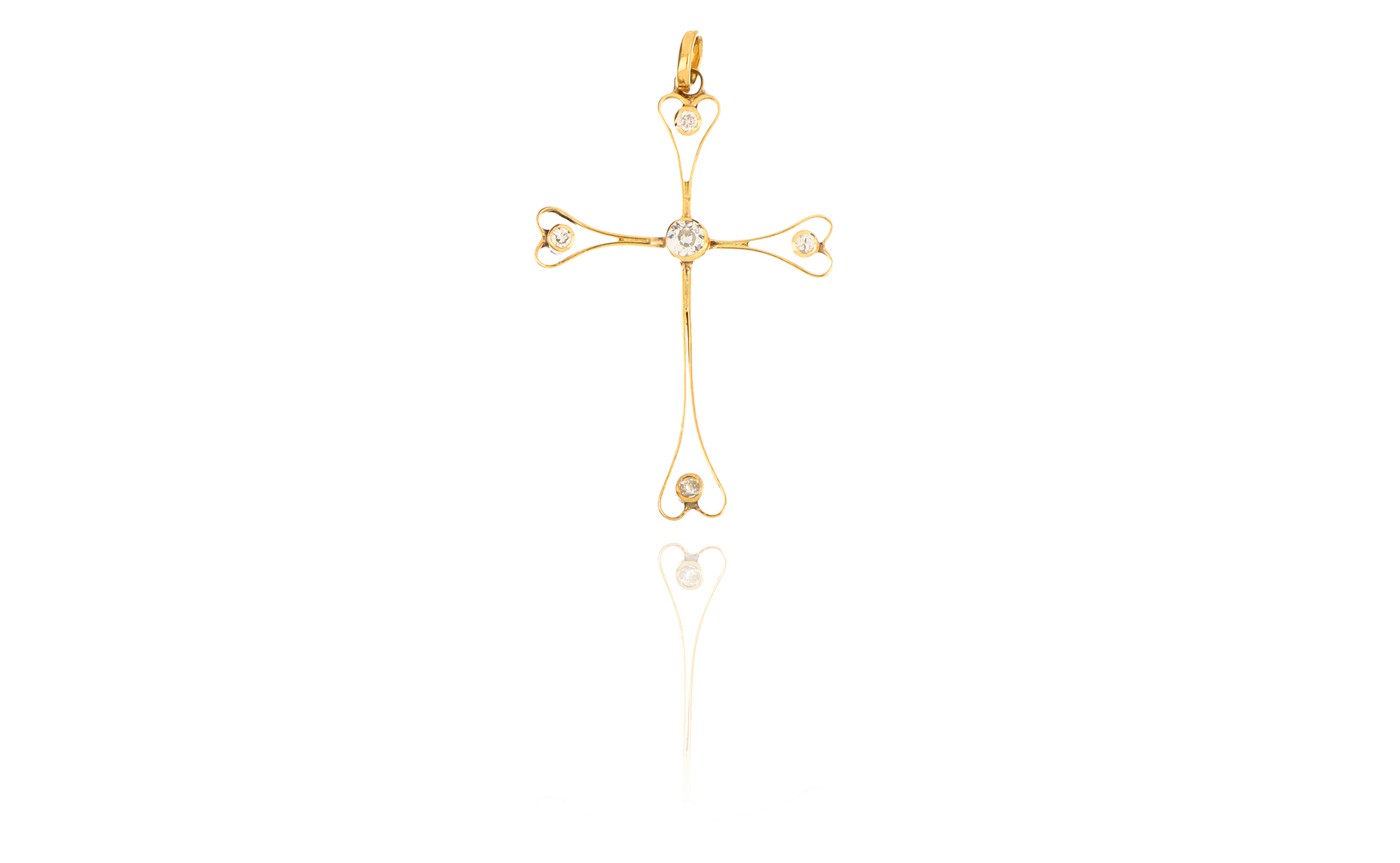Ciondolo a pendente in oro giallo a forma di croce con piccoli diamanti di taglio antico posti sui terminali dei bracci ed al centro per stimati 0 35 ct.