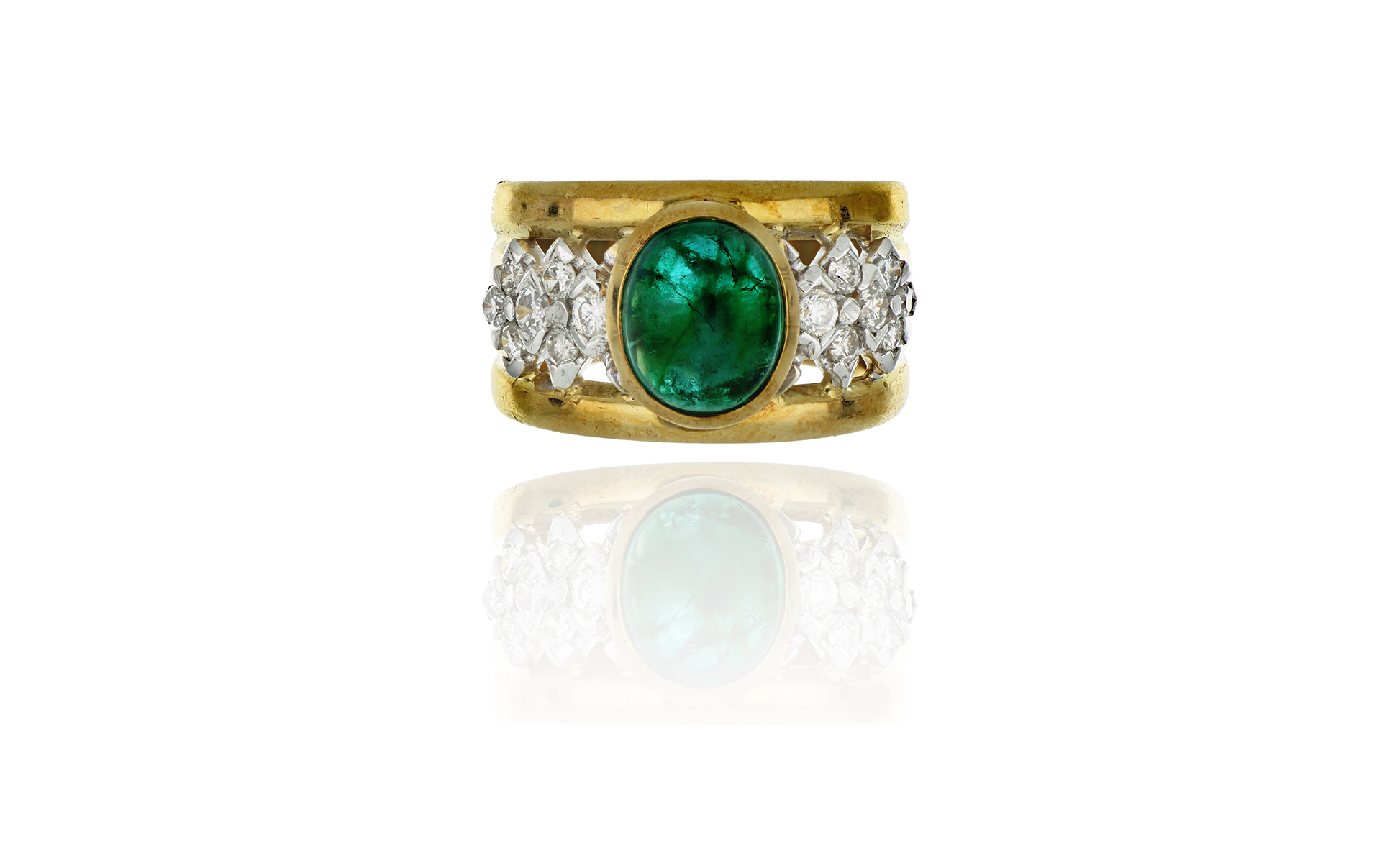 Anello a fascione in oro giallo traforato e ornato con uno smeraldo ovale cabochon di ct. 2 50 ca. e affiancato da piccoli diamanti taglio brillante.