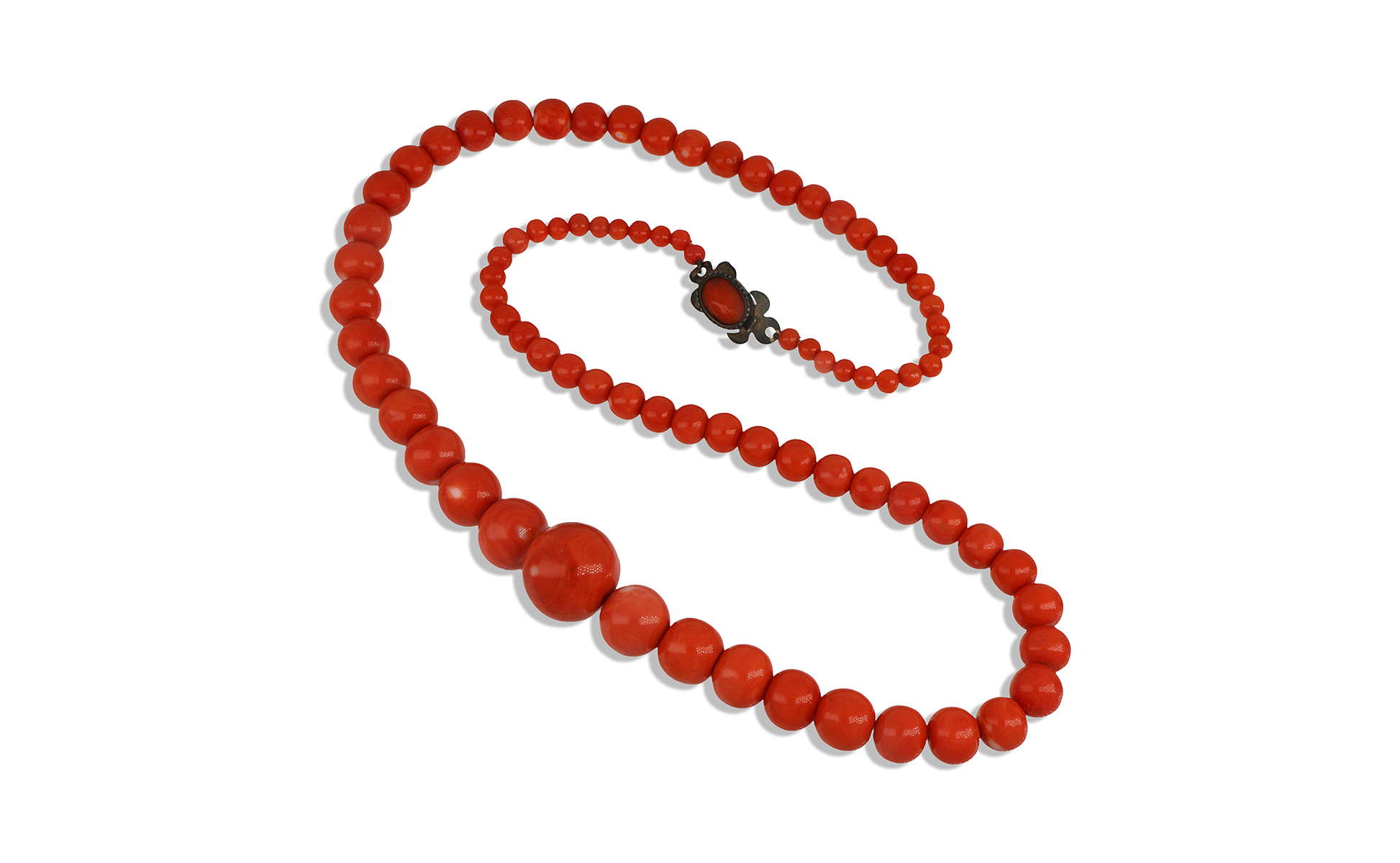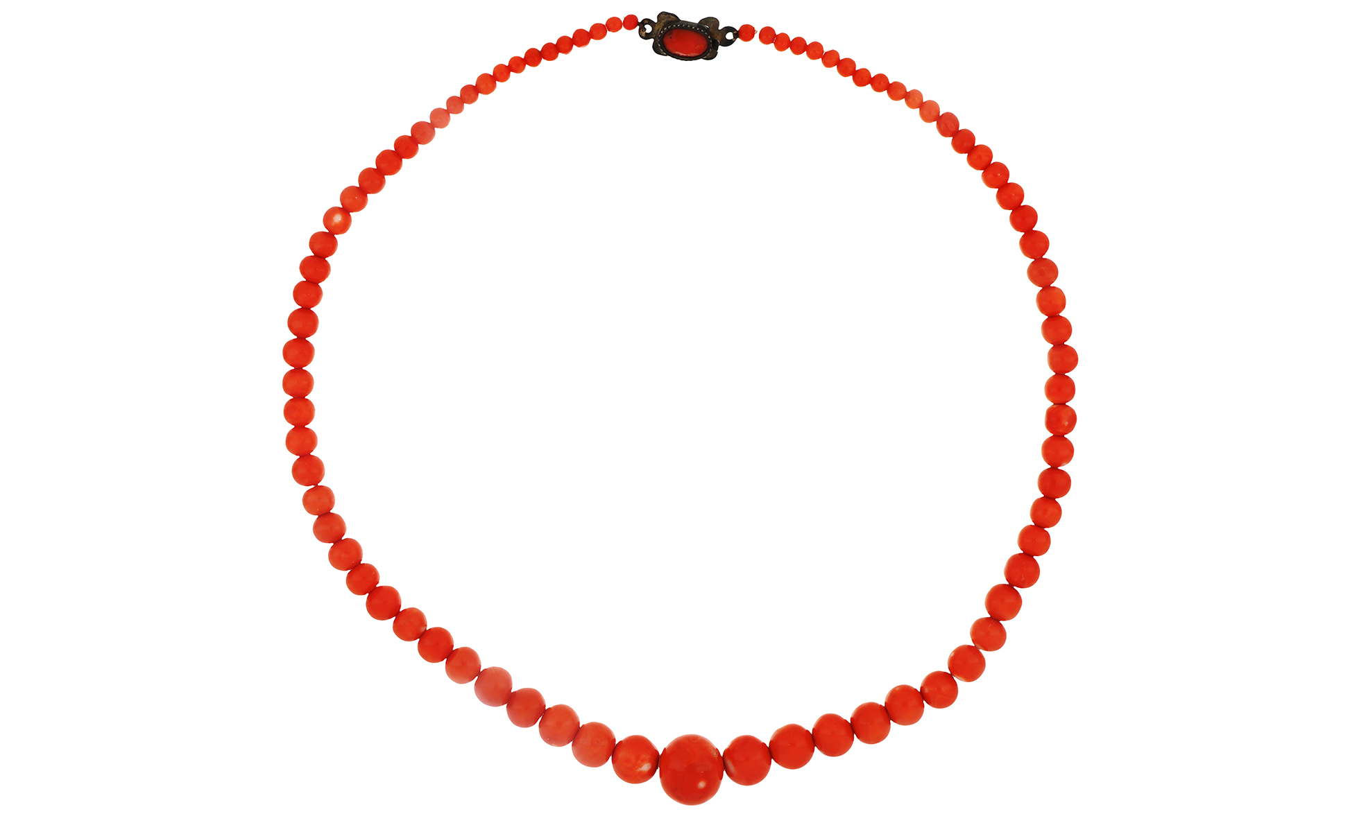 Collana in corallo rosso giapponese a sfere scalari da 5 a 19 mm di diametro.