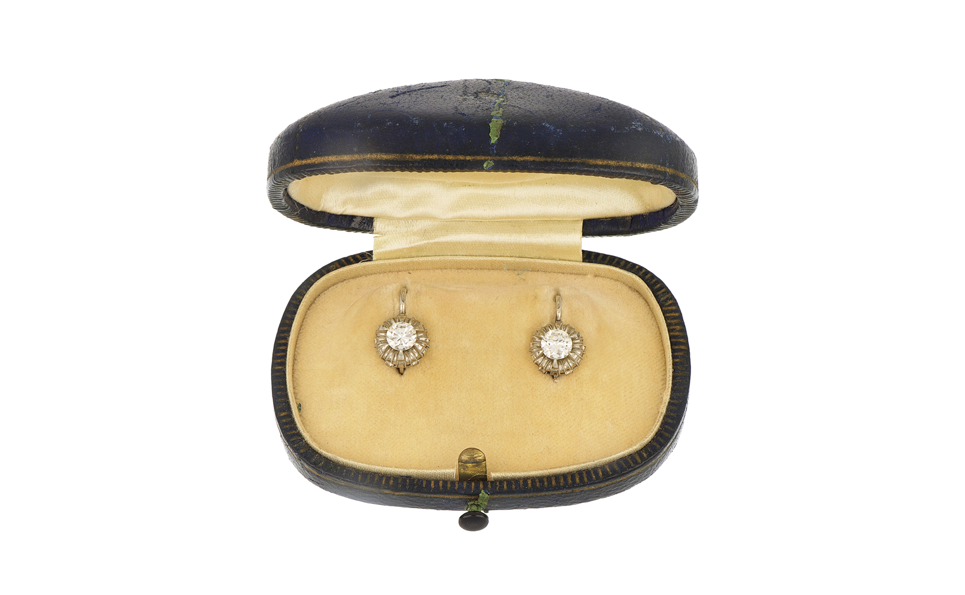 Orecchini a monachella in oro bianco al centro due diamanti taglio brillante per ct. 0 55 ca. cad. astuccio originale.