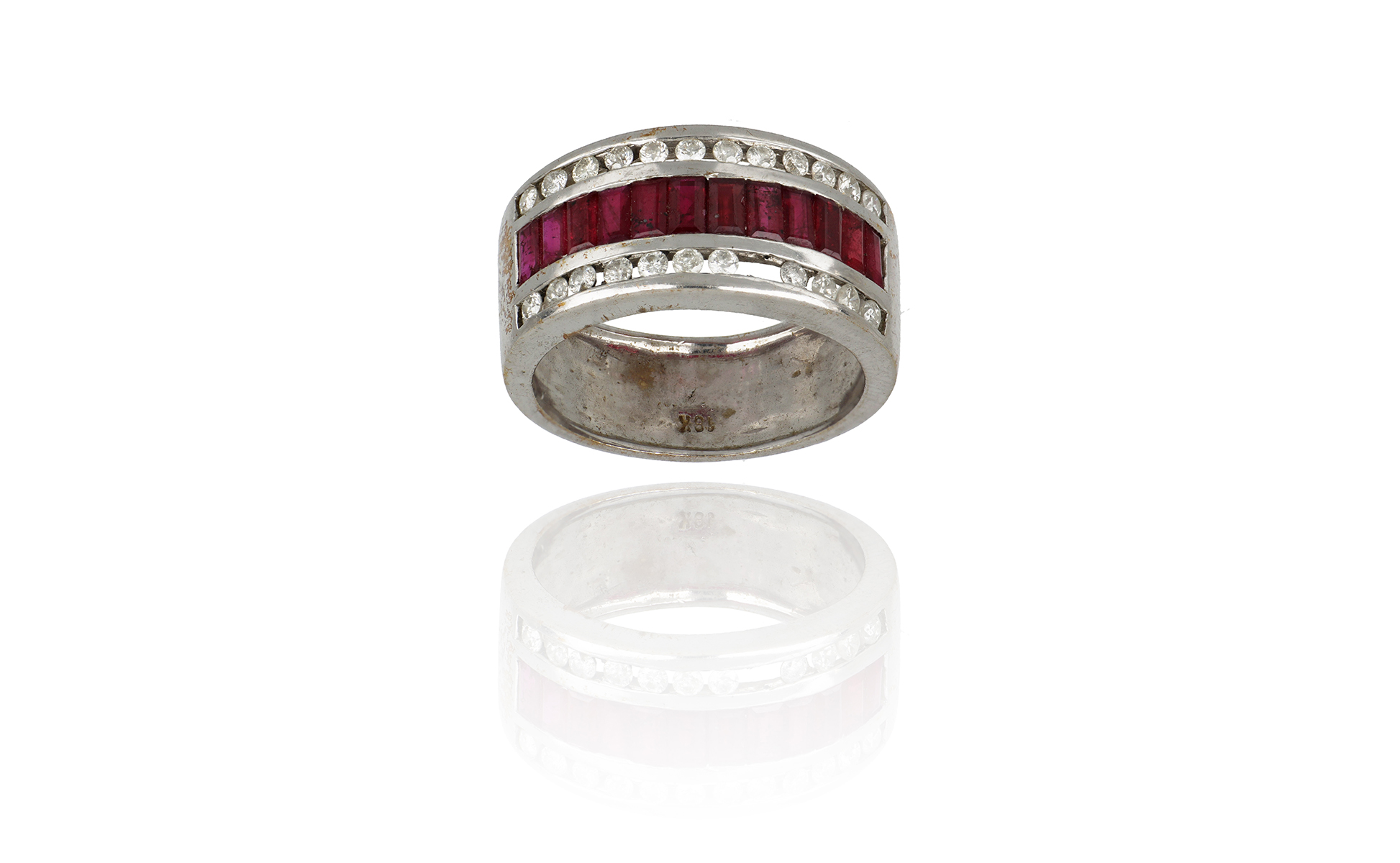 Anello a fascia in oro bianco con al centro riviere di baguette di rubini ai fianchi binario di diamanti tondi taglio a brillante per stimati 0 30 ct.