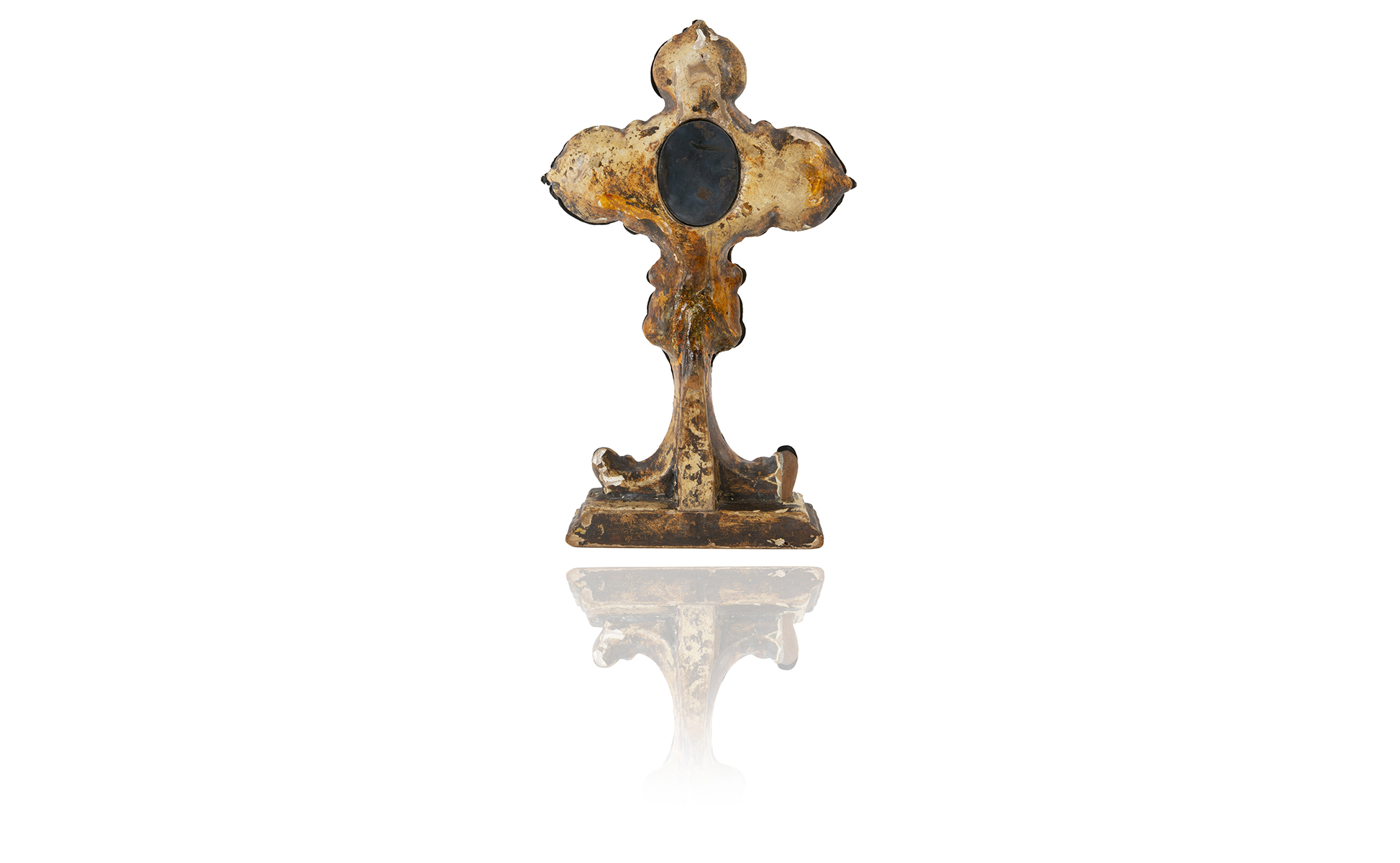 Reliquiario a croce in lamina d'argento sbalzata e cesellata legno Genova bollo della Torretta per l'anno 1727.