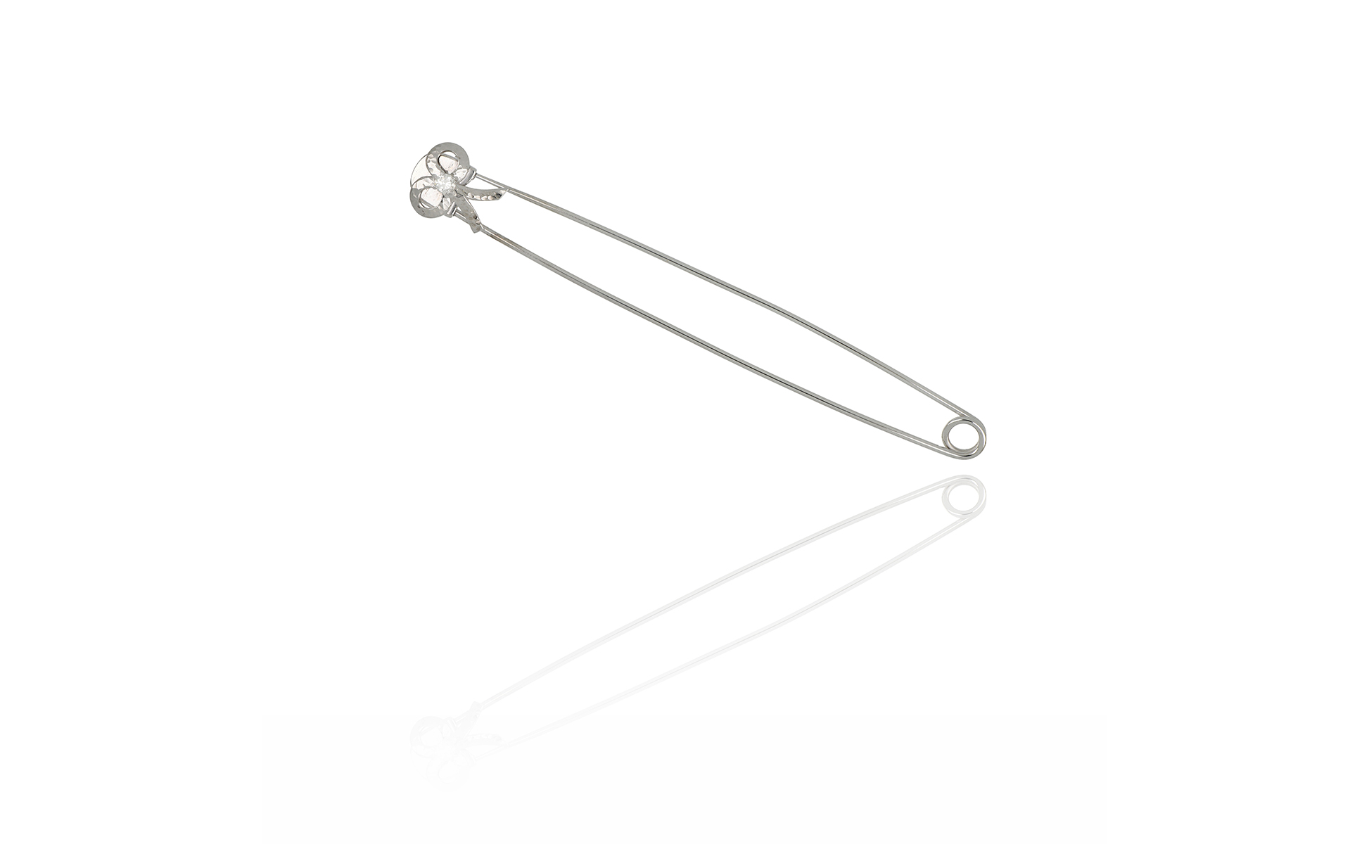 Lungo e curioso spillone da balia in oro bianco sulla chiusura un diamante taglio brillante di ct. 0 30 ca.