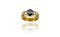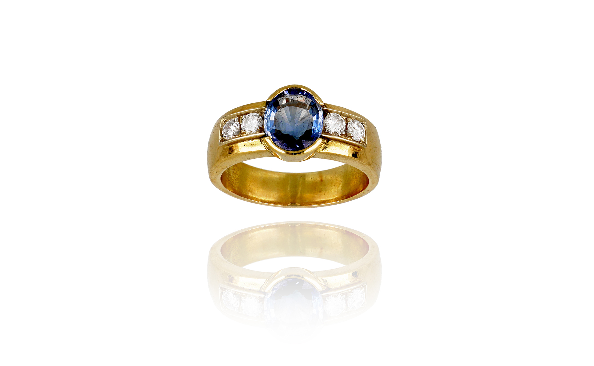 Anello a fascetta in oro giallo al centro zaffiro ovale di ct. 1 80 ca. e 4 diamanti taglio brillante ai fianchi.