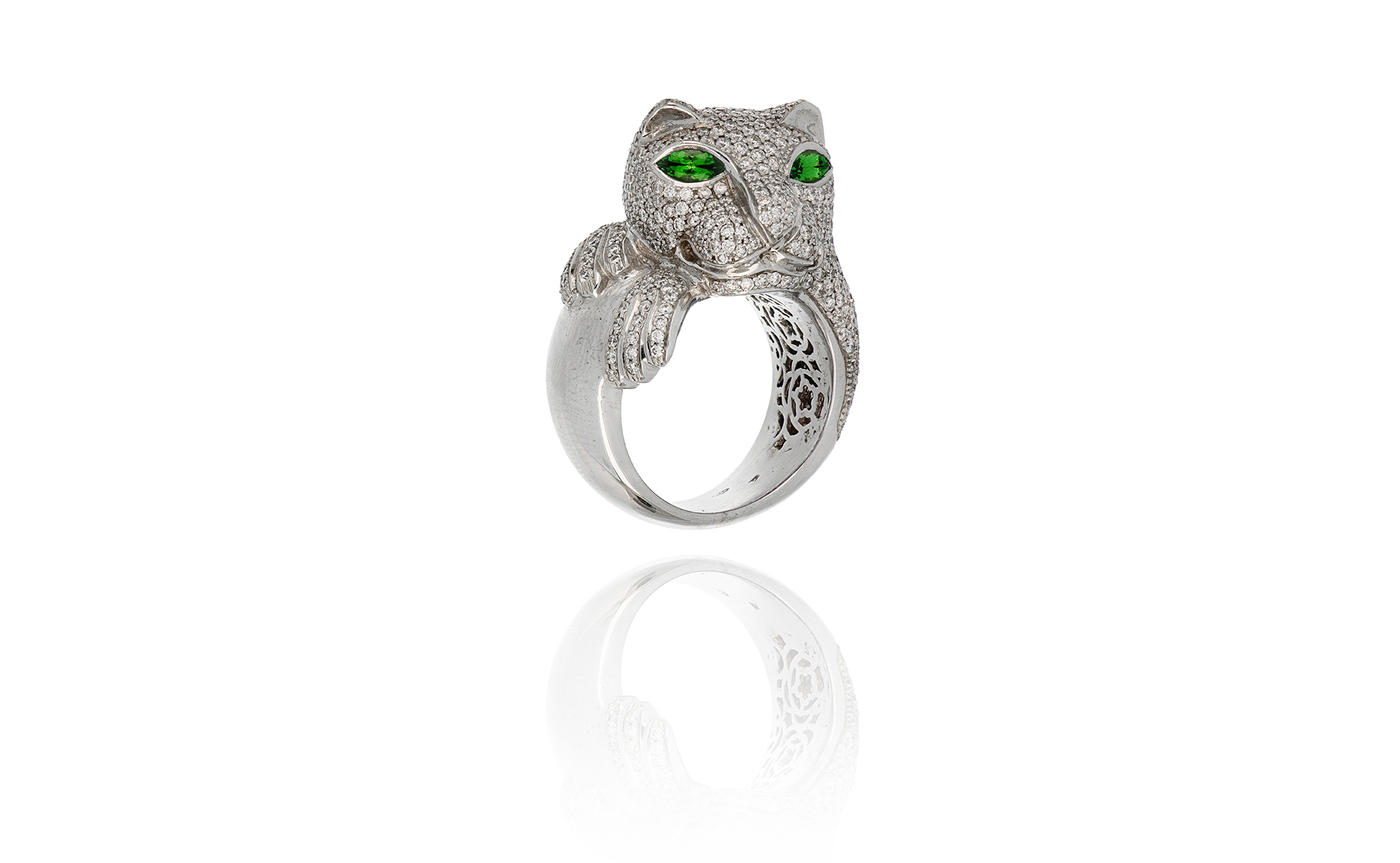 Anello Panthère in oro bianco con grande pavè di diamanti per stimati 2 0 ct navette di tzavorite a decorare gli occhi. Notevole lavoro di incassatura.
