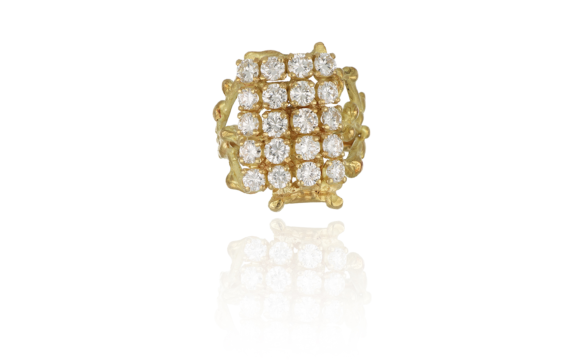 Anello in oro giallo grande scudo rettangolare interamente ricoperto con 20 diamanti taglio brillante disposti a scacchiera ct. 3 5 ca. lavorazione alla maniera di Sforza.