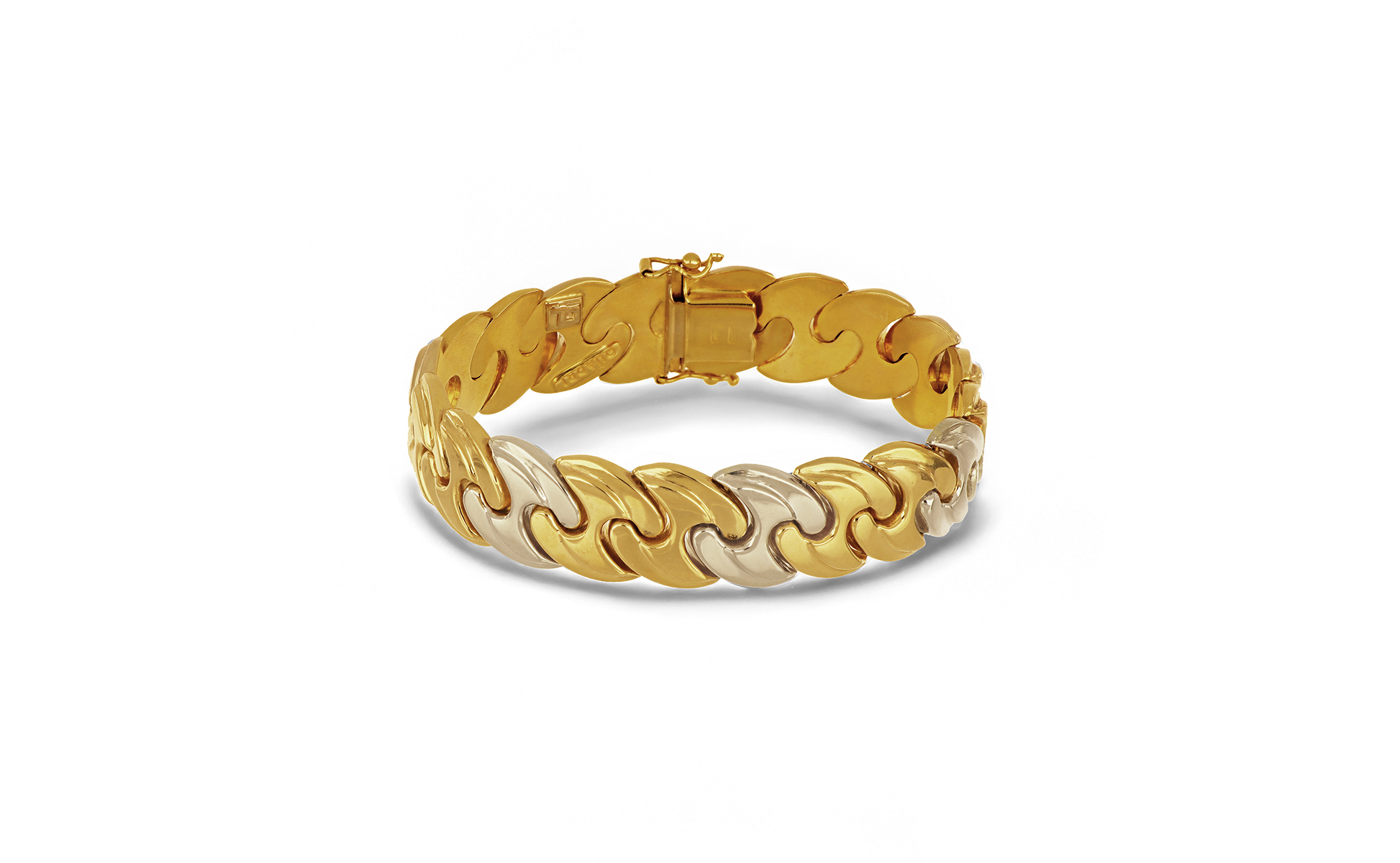 Bracciale snodato in oro giallo e bianco a motivi geometrici ricorrenti finitura lucida in perfette condizioni di conservazione.
