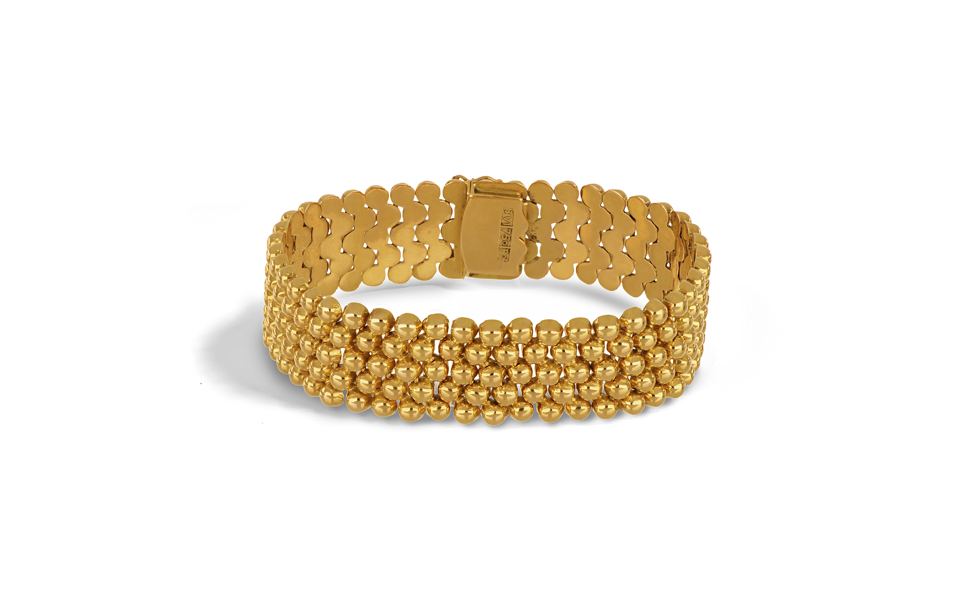 Bracciale a nastro in oro giallo piccole semisfere in canna vuota disposte su 5 file a formare un morbido nastro.