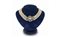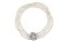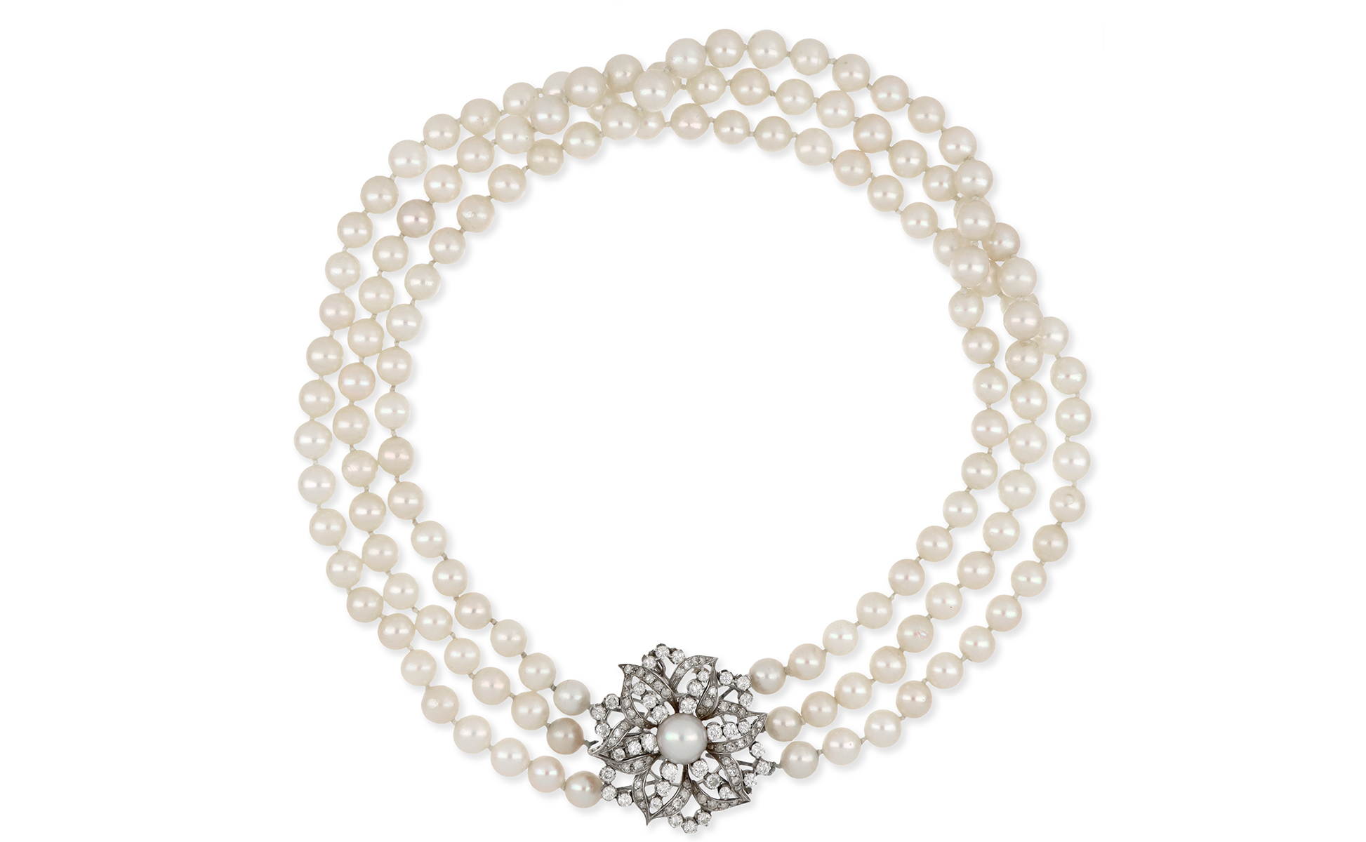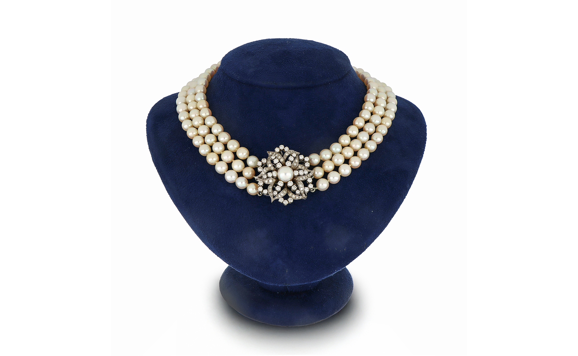 Collana di perle coltivate giapponesi 3 fili di diametro 7 3 mm al centro chiusura a rosone in oro bianco con perla centrale tempestata da piccoli diamanti taglio brillante e 8/8 per ct. 2 10 ca.