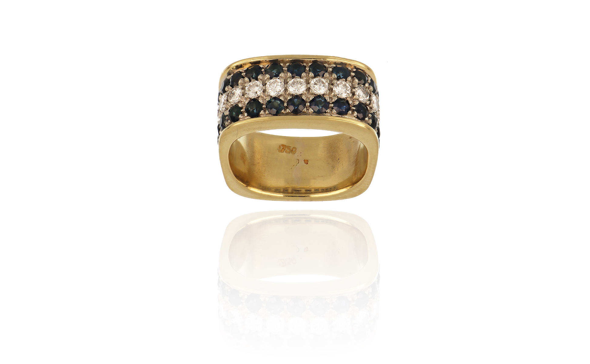 Anello a fascia in oro giallo con riga centrale di diamanti di forma rotonda taglio a brillante per stimati 0 65 ct. complessivi e zaffiri laterali per stimati 1 60 ct.