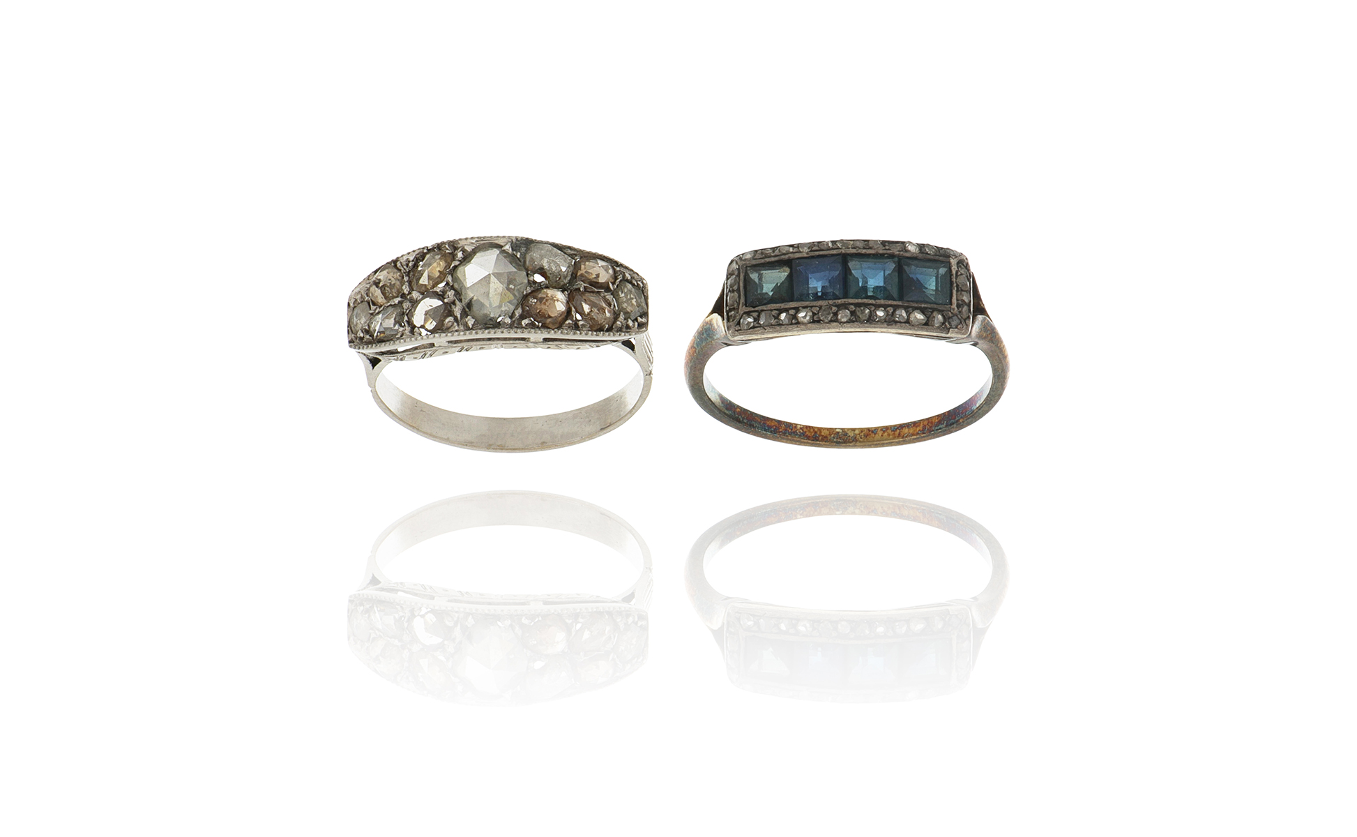 Lotto composto da una coppia di anelli in oro e argento con diamanti taglio a rosa e zaffiri carrè.