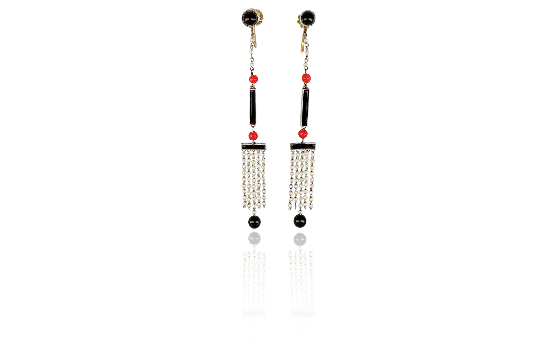 Lunghi e fini orecchini pendenti decò in oro anni '30 con microperle onice e corallo.