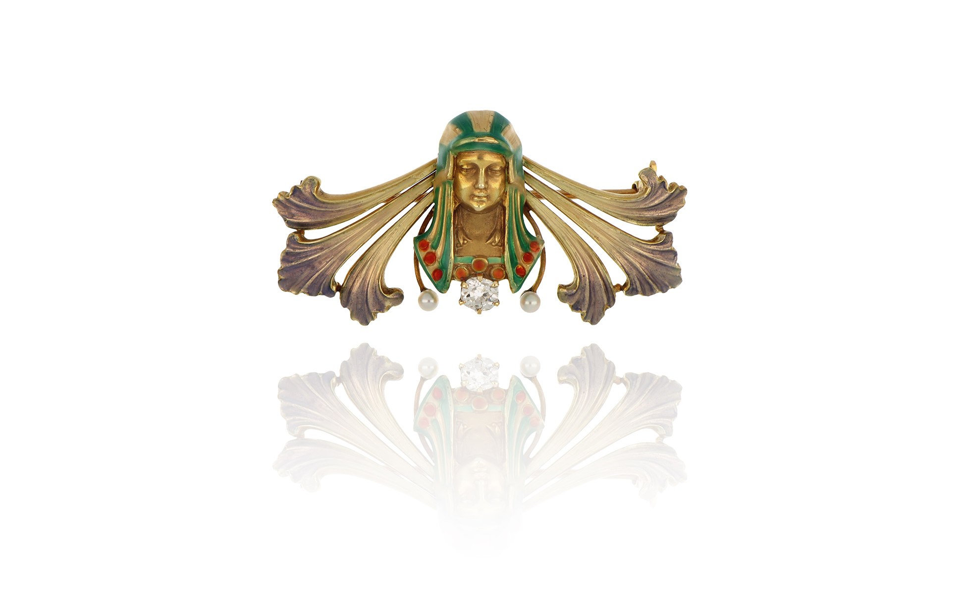 Spilla liberty 'Retour d'Egypte' con smalti sfumati e diamante di taglio antico di stimati 0 25 ct.