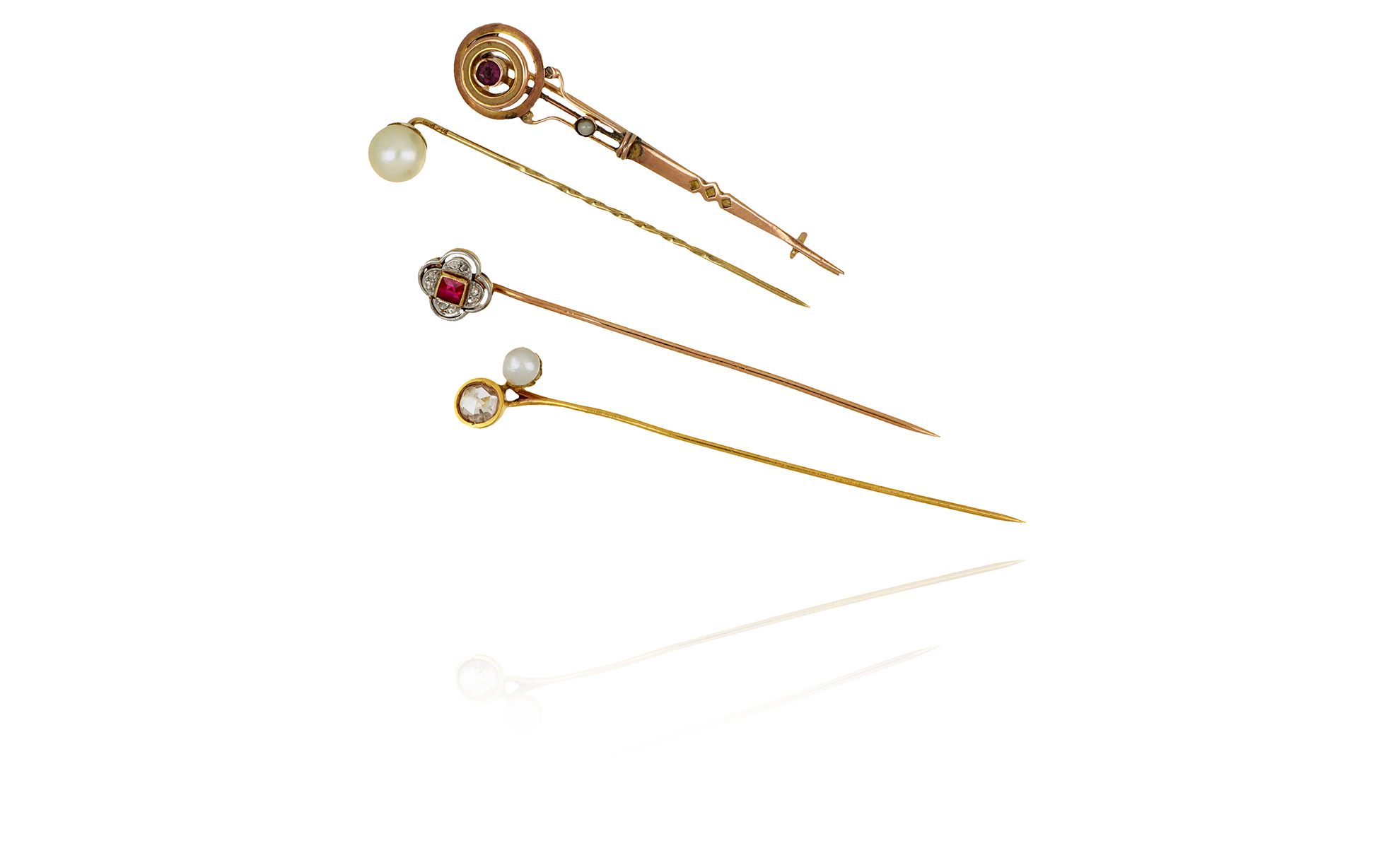 Lotto composto da 4 spillini da giacca in oro giallo con diamanti perle e piccoli rubini.