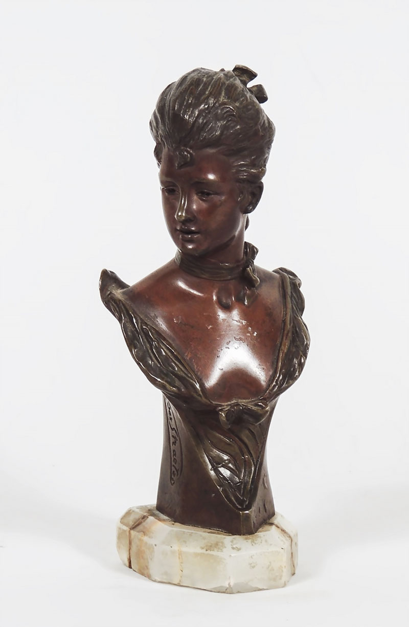 GEORGES VAN DER STATEN (1856-1928) Busto femminile scultura in bronzo di gusto liberty, su base sagomata in marmo bianco, firmata h cm 16 Reca il timbro della Société des Bronzes de Paris FEMALE BUST, BRONZE SCULPTURE