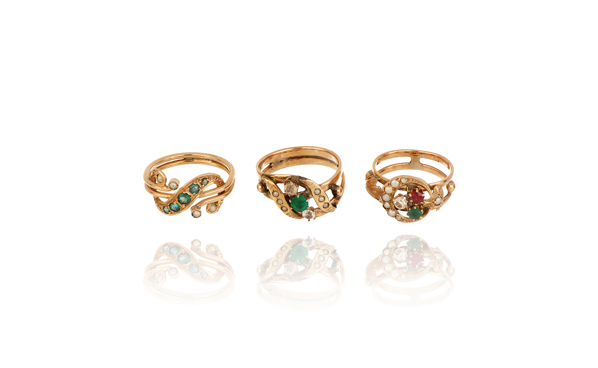 Lotto composto da 3 anelli in oro rosso antica manifattura realizzata in canna vuota a disegnare motivi floreali.
