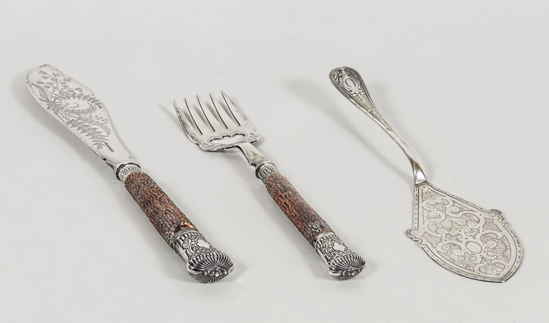 TRE POSATE DA PORTATA D'EPOCA una coppia in sheffield rilegate in argento, manici in osso ed una paletta da dolce in argento cesellato THREE SERVING CUTLERY PIECES