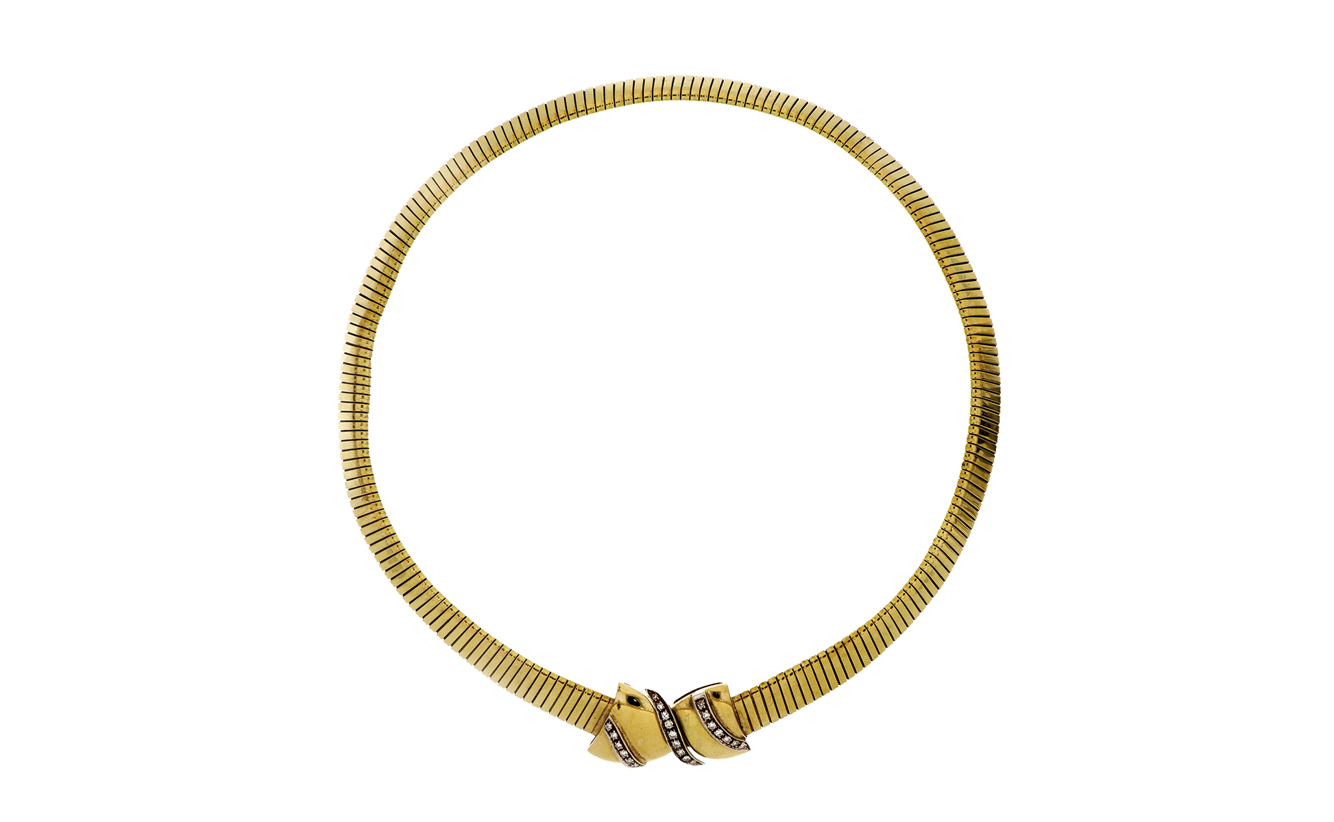 Girocollo in oro giallo a 'Tubo-Gas' la chiusura originalmente al centro apre sul fronte ed è decorata con piccoli diamanti taglio 8/8.