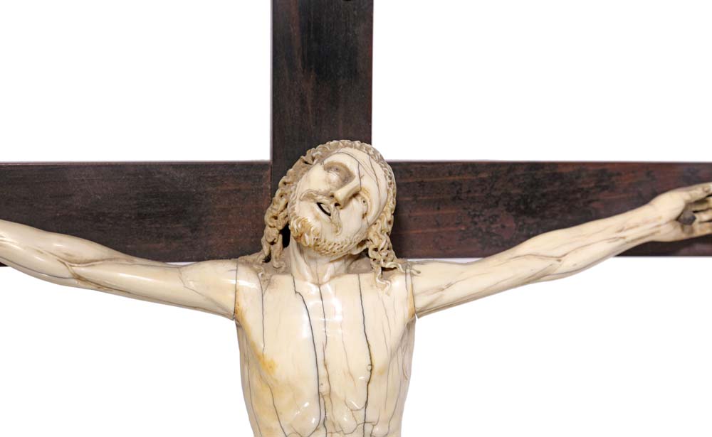 Christus Triumphans in avorio su croce lignea, Portogallo o Goa (?), fine XVIII/inizio XIX secolo la figura di Cristo, ritratta col corpo eretto, la testa ripiegata verso la spalla sinistra e gli occhi spalancati rivolti verso l'alto e la bocca aperta a richiamare non solo la morte, ma anche la risurrezione; il busto lascia emergere la definizione muscolare e le gambe, anch’esse modellate con attenzione, terminano con i piedi sovrapposti, trafitti da un unico chiodo. Il perizoma, fissato da un cordone annodato sul fianco destro, è caratterizzato da un ricco panneggio che ricade con grazia lungo il corpo. Il bordino, finemente intagliato, riproduce un motivo decorativo elaborato, probabilmente ispirato ai tessuti preziosi dell'epoca, conferendo all’intero drappeggio una sensazione di movimento e leggerezza. Sulla parte superiore della croce, titulus in avorio con iscrizione in ebraico, greco e latino. cm 70x36,5 - Cristo cm 29x29 Questo lotto, accompagnato da certificato CITES e da perizia tecnica rilasciata dal Ce.S.Ar Centro Studi Archeometrici, è disponibile per la vendita solo con spedizioni all'interno della Comunità Europea.