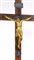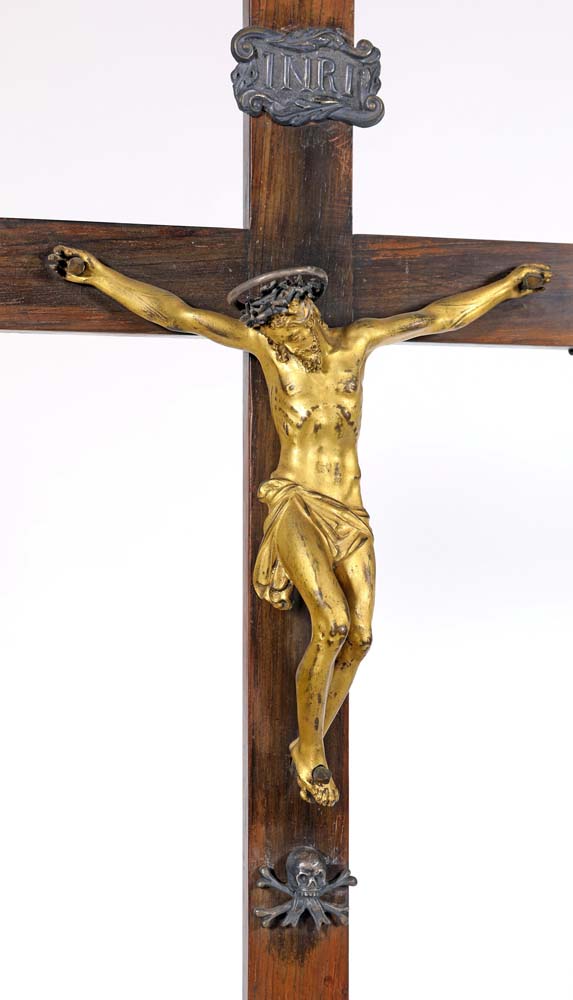 Crocifisso da altare in legno e bronzo dorato su base in marmo vari, XVIII secolo La figura di Cristo è rappresentata priva di vita, senza ferita al costato, raffigurando una versione sobria e intensa del momento della morte. Il corpo pende dalla croce con il capo reclinato sul petto e gli occhi chiusi. Le braccia restano tese e inchiodate, mentre le gambe sono leggermente piegate, segnando il peso del corpo abbandonato. L’assenza della ferita al costato, solitamente simbolo del colpo inferto dopo la morte, suggerisce una scelta simbolica volta a concentrarsi sulla purezza e sulla solennità della morte stessa. Croce con titulus crucis e teschio in argento; terminali in metallo sbalzato e dorato. Base in marmi broccatello, nero, giallo e rosso, decorata su entrambe le facciate da un piccolo cammeo. cm 57x30x8 - Cristo cm 16x15,5