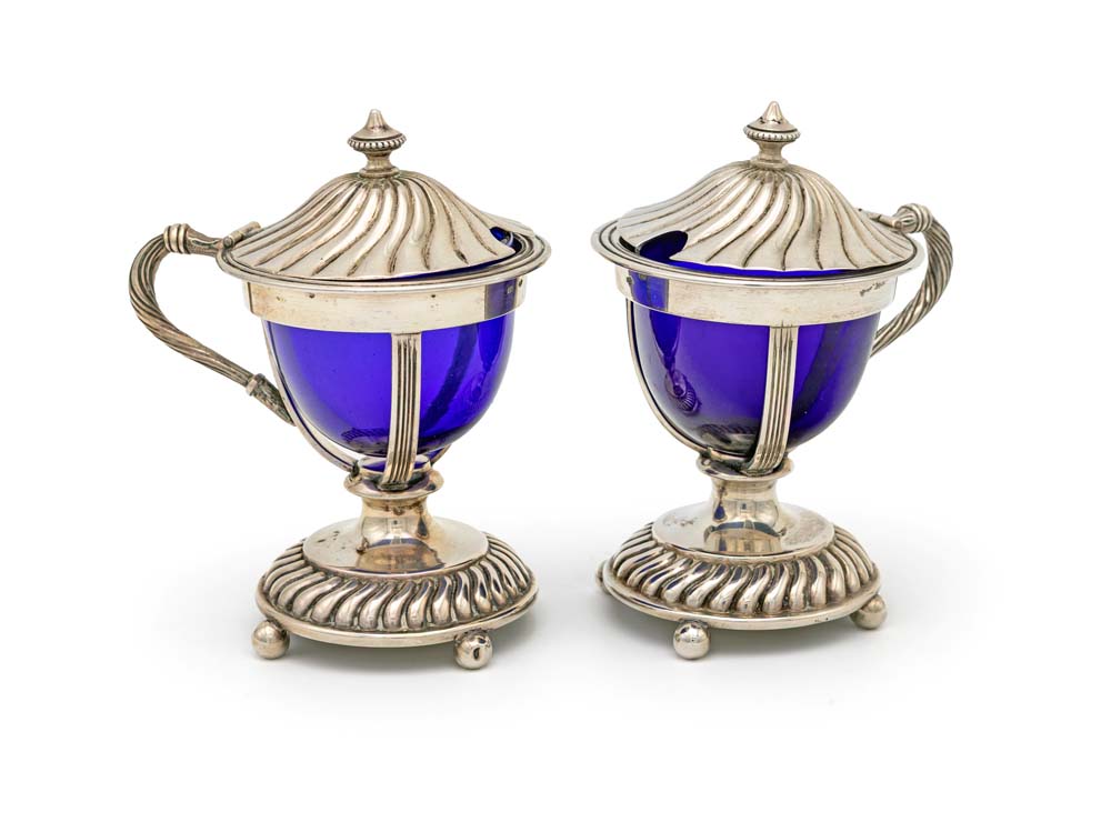 Coppia di saliere in argento e vetro blu corpo a coppa con manico e coperchio incernierato; piede circolare con orlo baccellato su piedi a sfera cm 12,5x10x7,5 - gr. 330