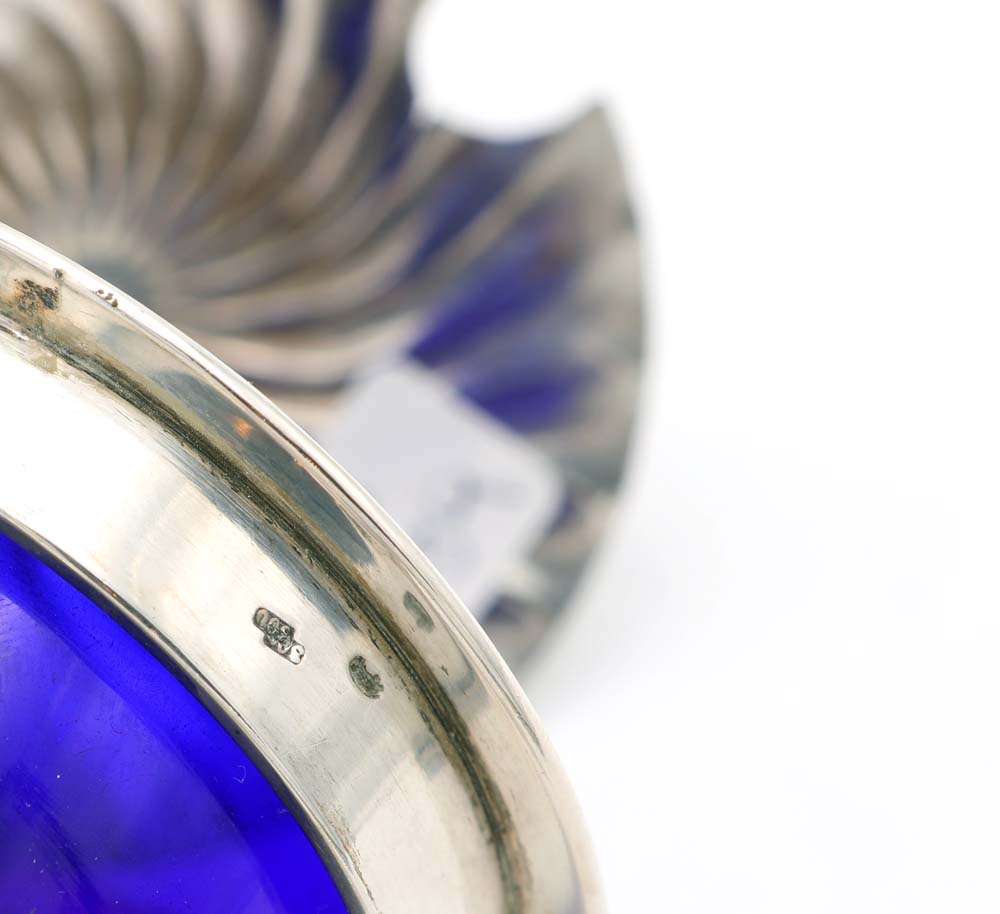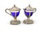 Coppia di saliere in argento e vetro blu corpo a coppa con manico e coperchio...