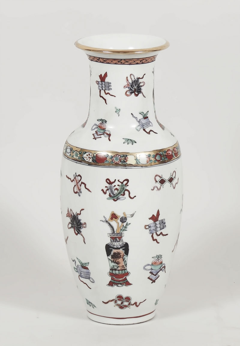 VASO A BALAUSTRO IN PORCELLANA Cina, inizio del XX secolo dipinto con oggetti simbolici e lumeggiato in oro, firmato sotto la base, difetto h cm 31 PORCELAIN BALUSTER VASE, CHINA, EARLY 20TH CENTURY