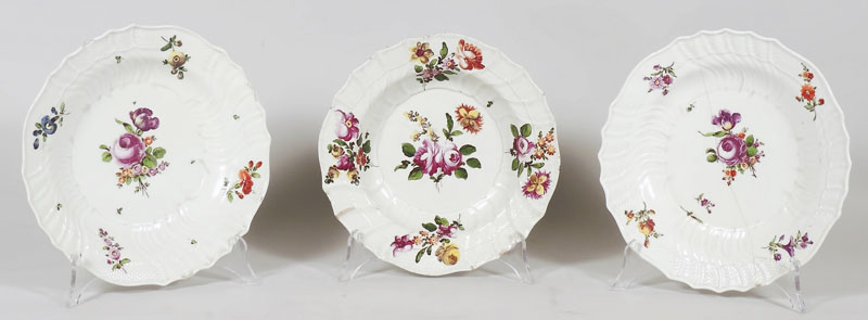 TRE PIATTI IN PORCELLANA Vienna, XVIII secolo dipinti con fiori policromi, uno felato THREE PORCELAIN PLATES, VIENNA, 18TH CENTURY