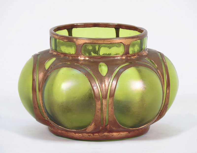 PICCOLO VASO IN VETRO IRIDESCENTE VERDE probabilmente Manifattura Loetz corpo baccellato, lumeggiature in oro h cm 12 SMALL IRIDESCENT GLASS VASE, PROBABLY LOETZ