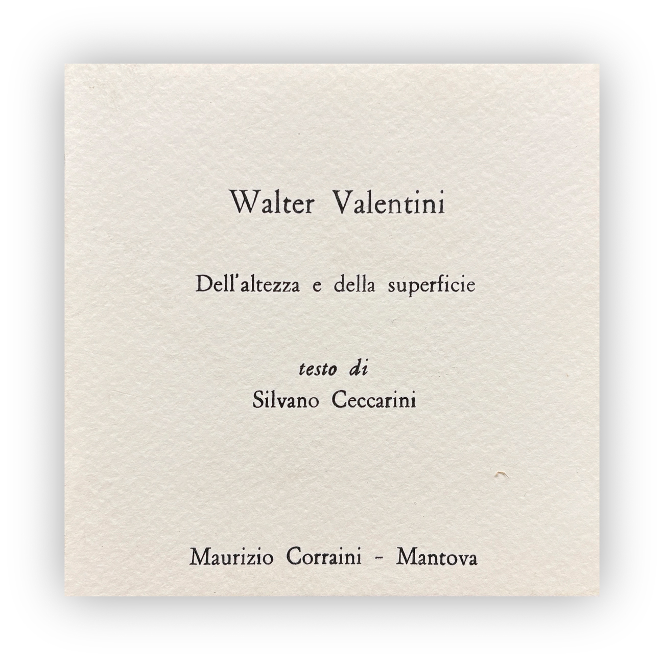 Opera contenuta all'interno del catalogo "Walter Valentini - Dell'altezza e della superficie" con testi di Silvano Ceccarini, Edizioni Maurizio Corraini, Mantova, edito in occasione della mostra e stampato in 1000 esemplari