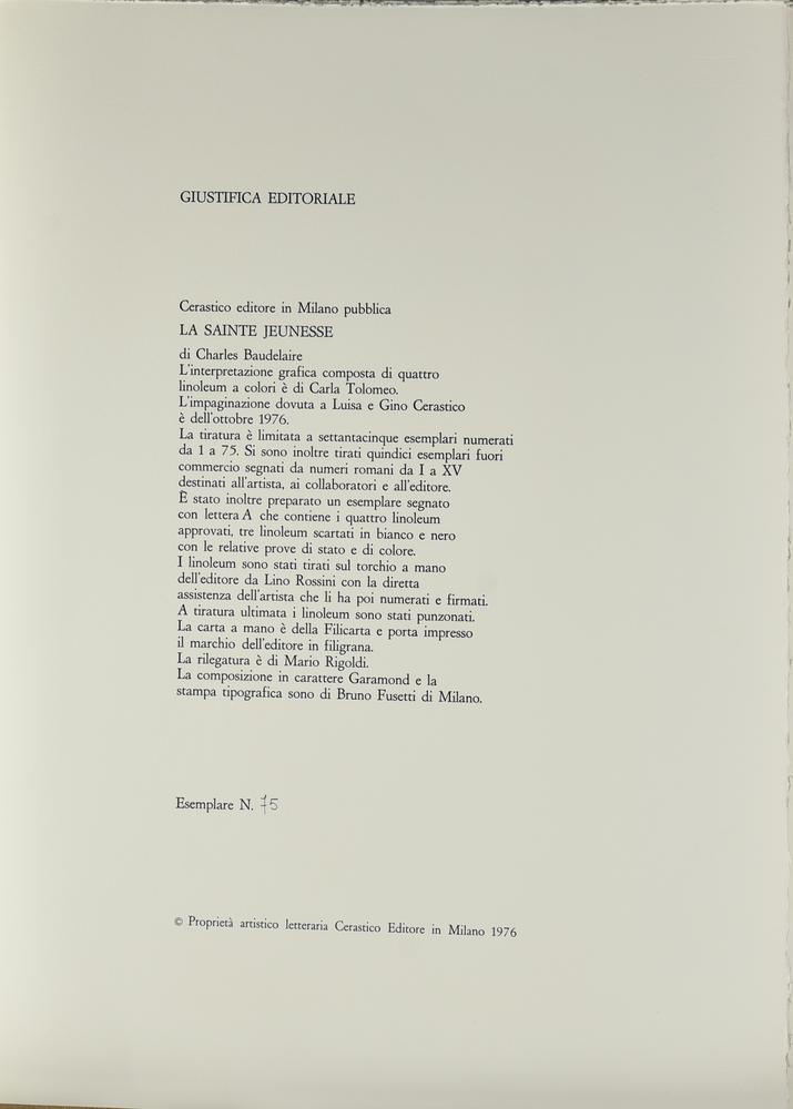 Carla Tolomeo (1941) LA SAINTE JEUNESSE, 1976 cartella contenente un testo di...