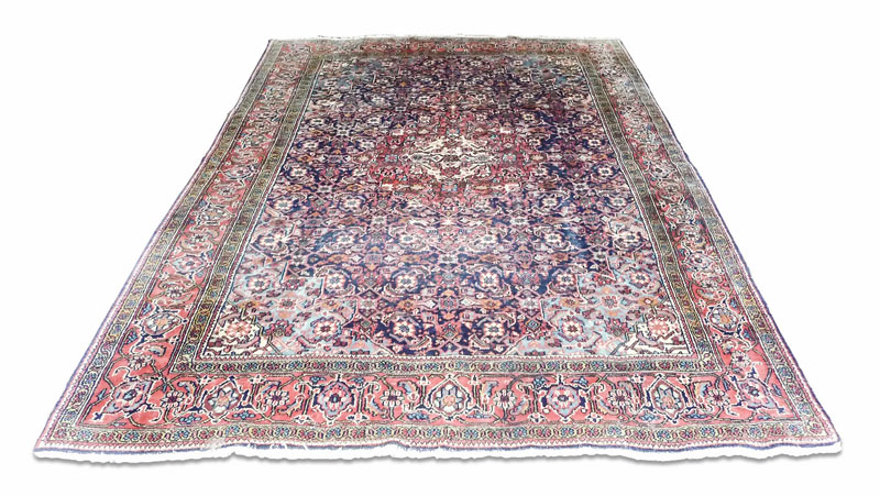 TAPPETO PERSIANO fondo blu, campo a motivo floreale con medaglione centrale nei toni dell'arancio e dell'avorio cm 328x225 PERSIAN RUG