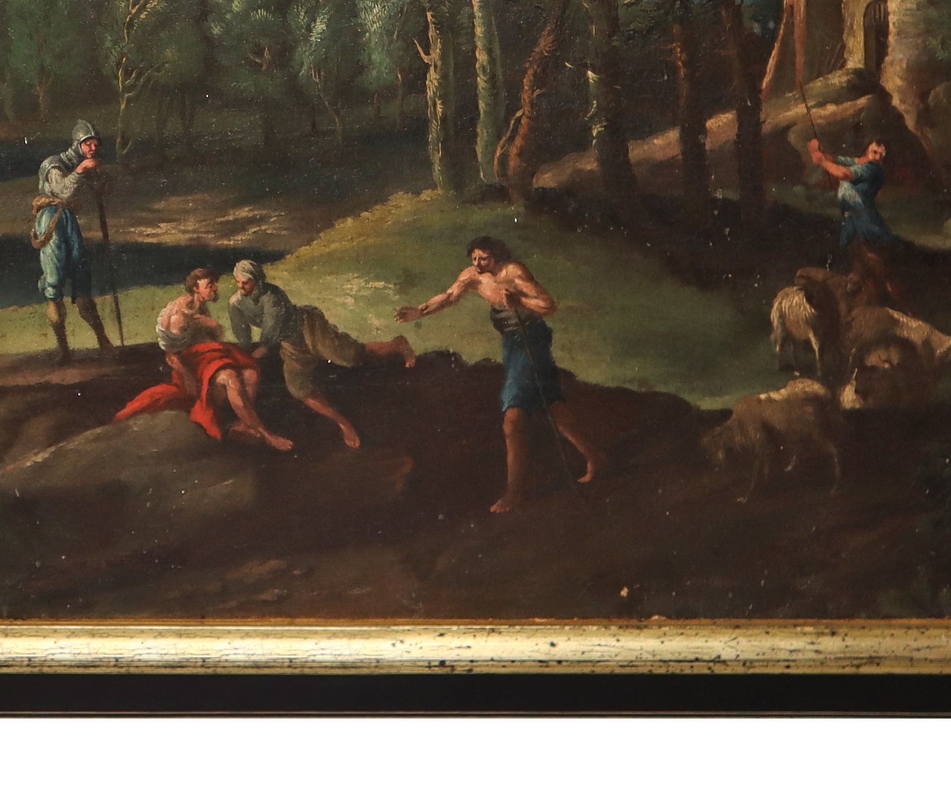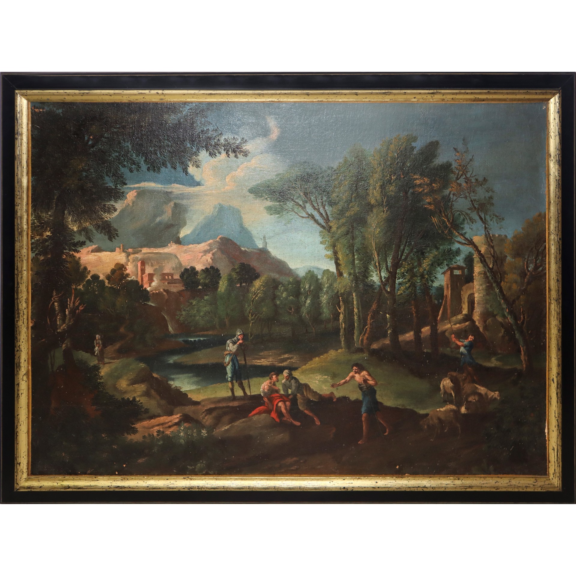 Andrea Locatelli (Roma 19.02.1695 - Roma 19.02.1741) - Paesaggio con personaggi, 17° secolo cm 72x100 - in cornice H cm 83x110 olio su tela La scena raffigurata da Locatelli nel dipinto in esame è ambientata in un tipico paesaggio romano, rurale e vivace, la cui composizione si sviluppa per piani successivi in luce e in ombra fino allo sfumato dell’orizzonte. Andrea Locatelli, allievo di Monsù Alto, lavorò al servizio di molte famiglie nobiliari romane e visse le trasformazioni culturali della città. L’animato clima di Roma e la vicinanza ad opere firmate da pittori come Salvator Rosa e Jan Frans van Bloemen influenzarono significativamente la produzione artistica di Locatelli. Il suo stile si ispira infatti al realismo dei modelli a lui contemporanei e nelle sue opere prende vita un'atmosfera di carattere arcadico pastorale e allegorico.