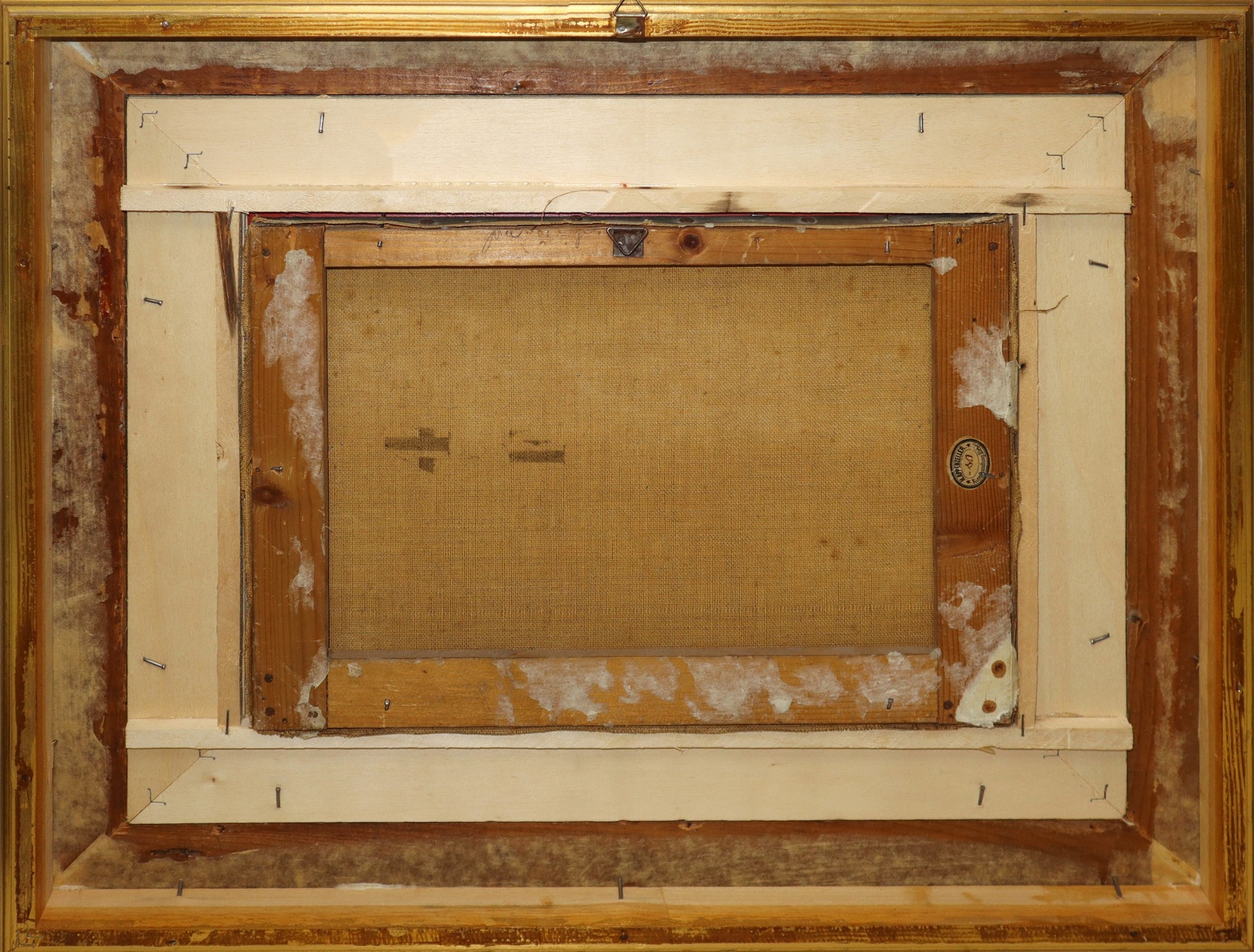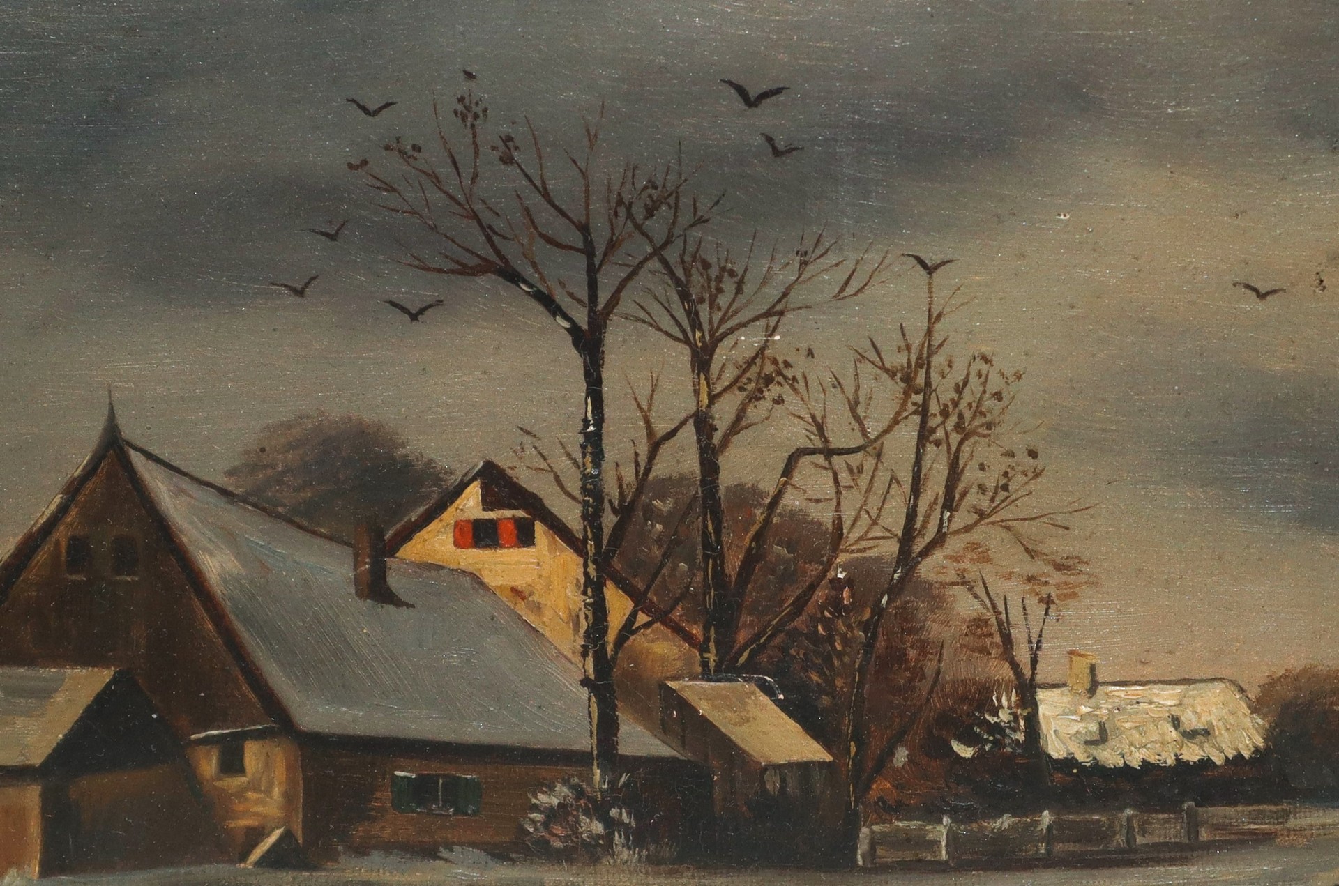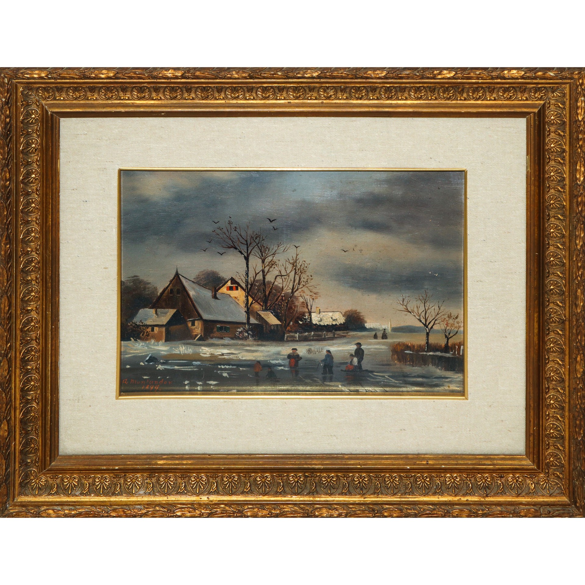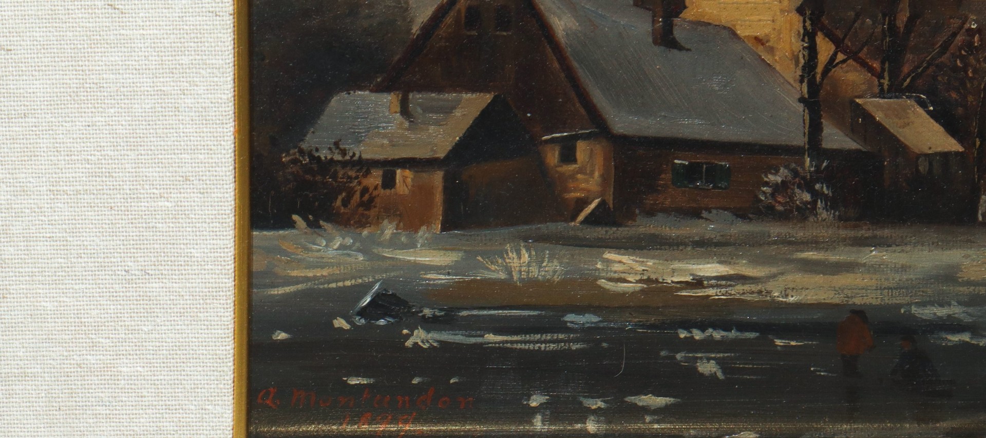 Paesaggio innevato con personaggi, 1899 h cm 24X33 in cornice h cm 45X54 olio su tela Firmato in basso a sinistra A.Montandon e datato.