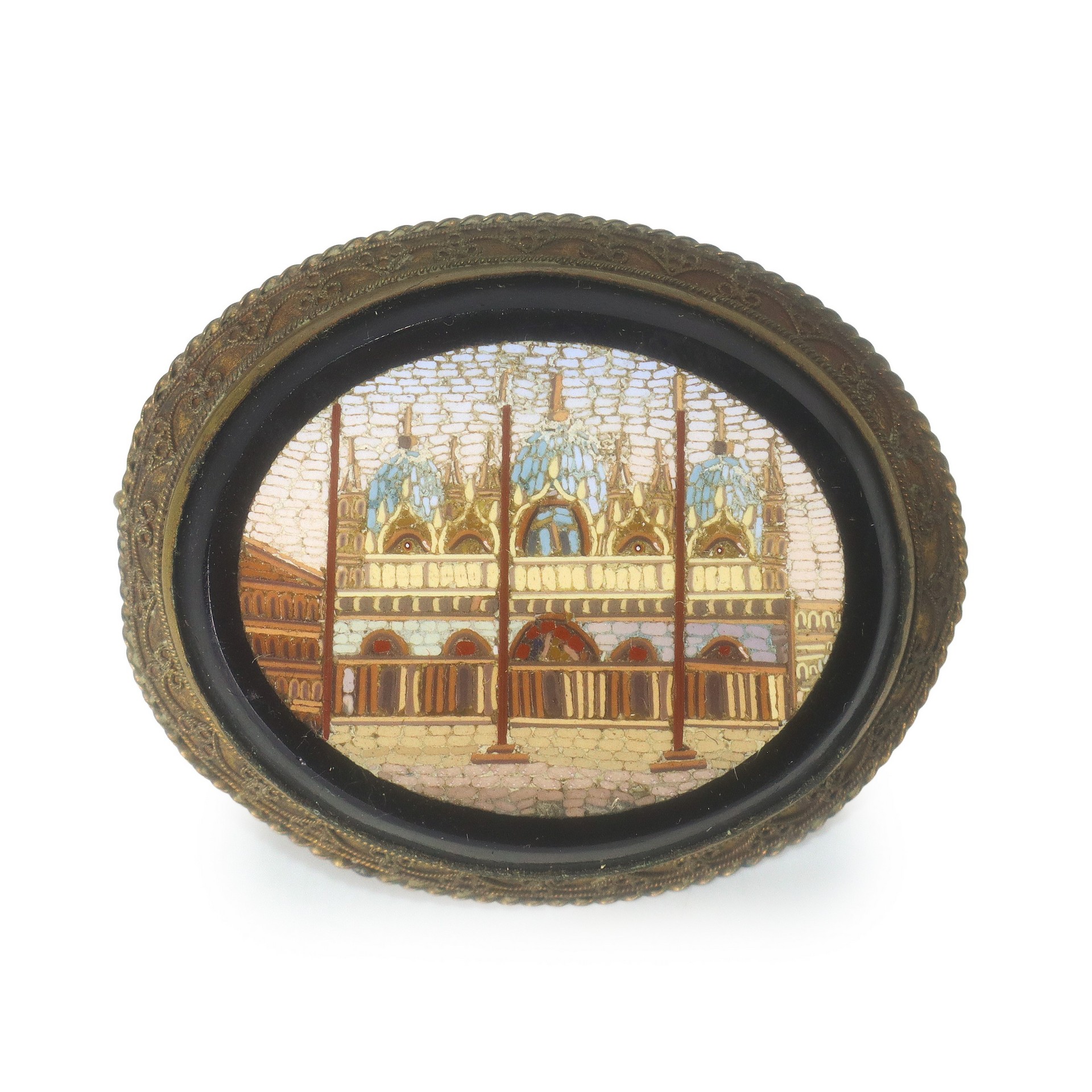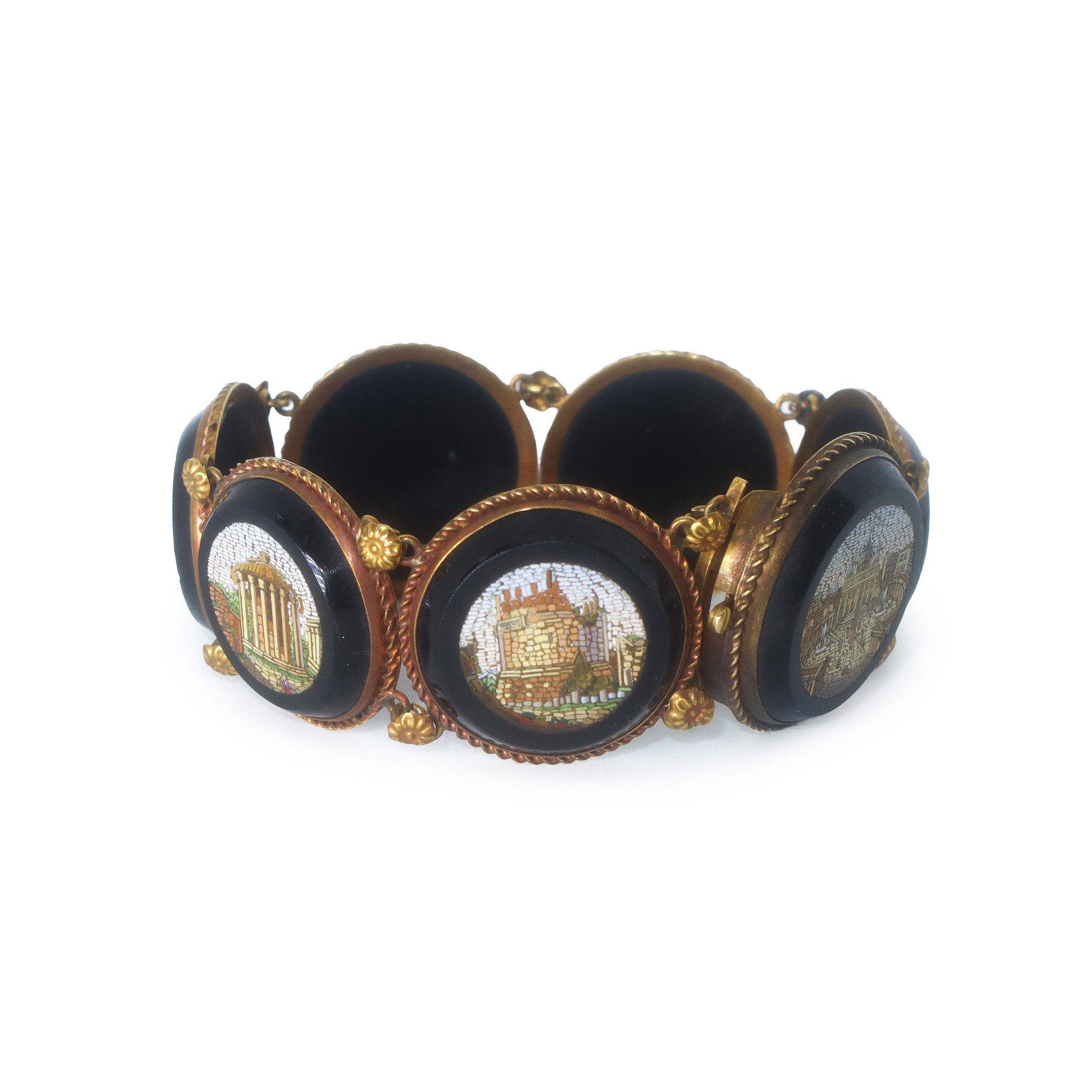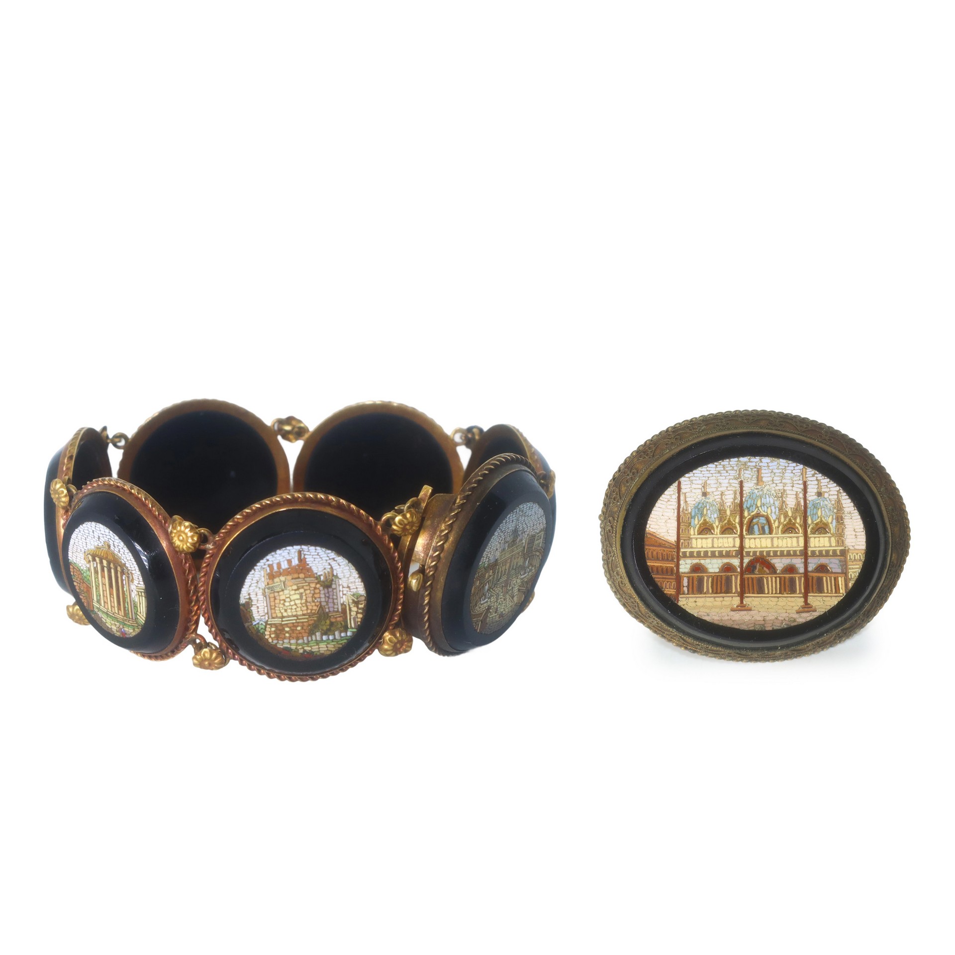 Bracciale a 7 micromosaici raffigurante monumenti romani con spilla con micromosaici raffigurante Duomo di Venezia, fine 20° secolo