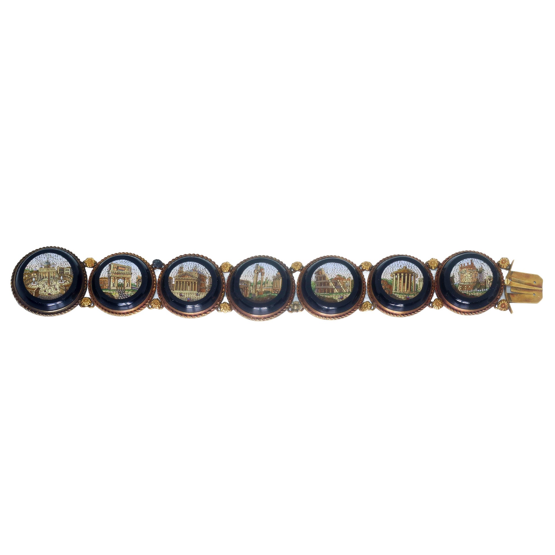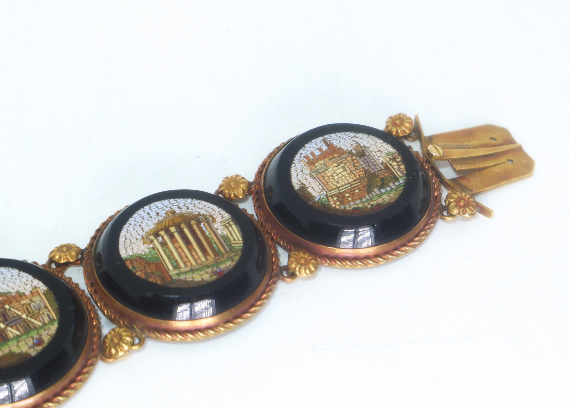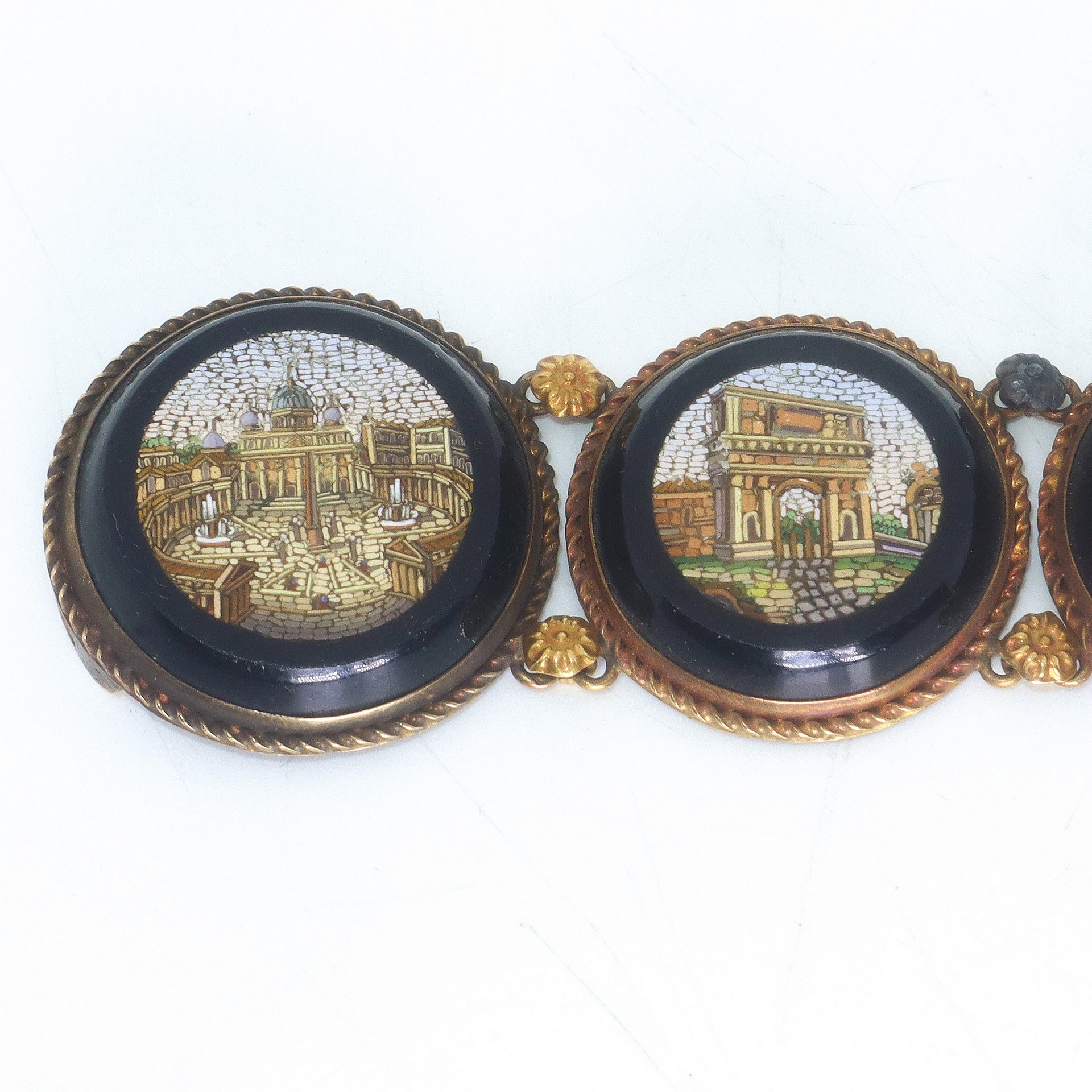 Bracciale a 7 micromosaici raffigurante monumenti romani con spilla con micromosaici raffigurante Duomo di Venezia, fine 20° secolo dimensione medaglioni mm 27