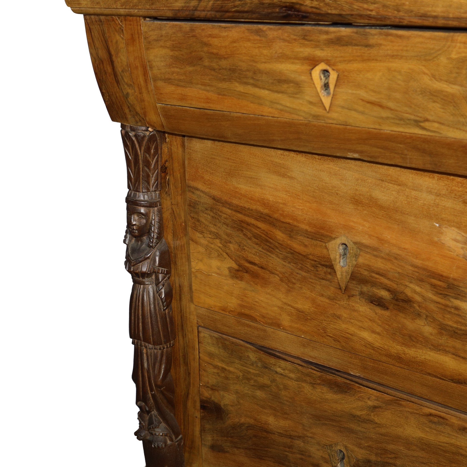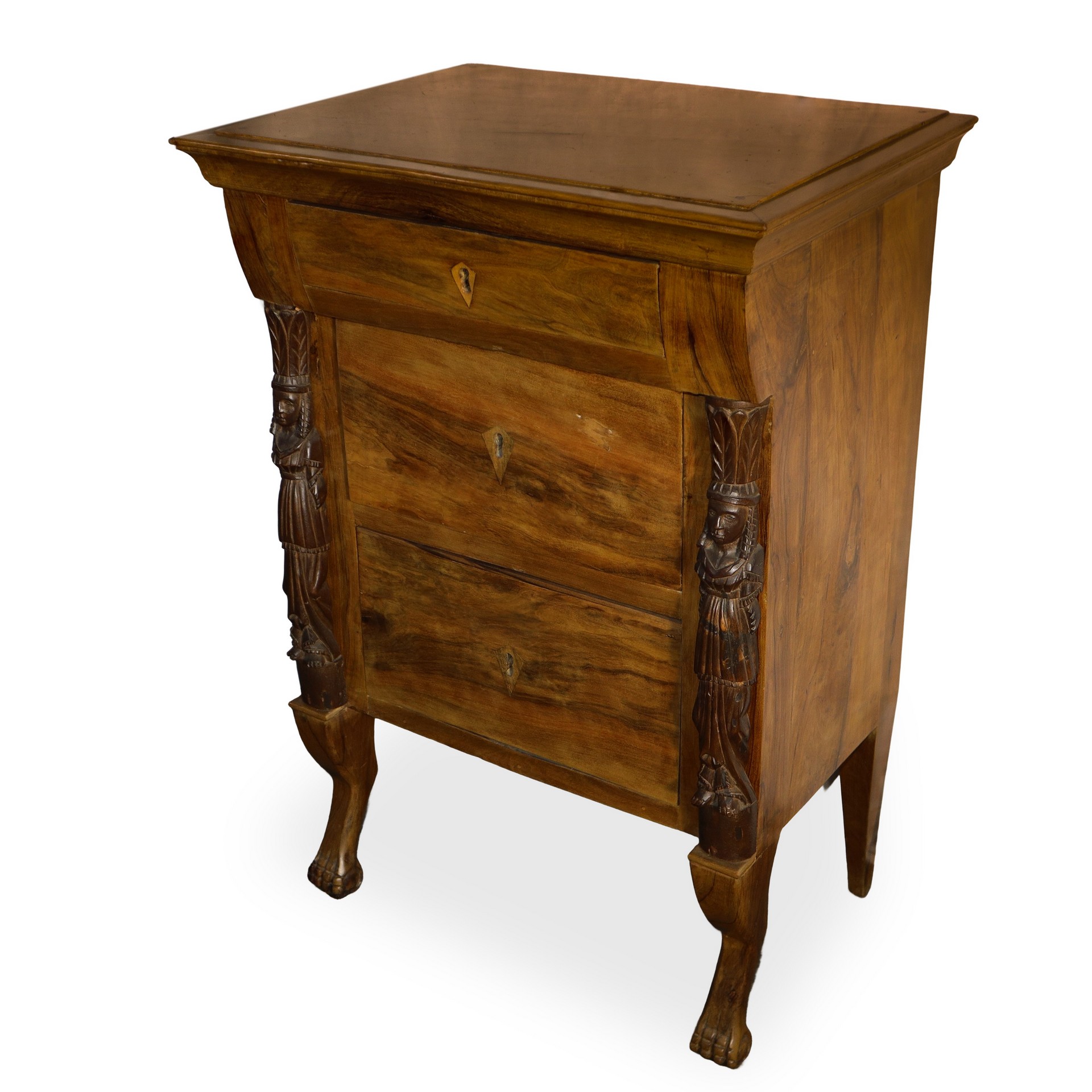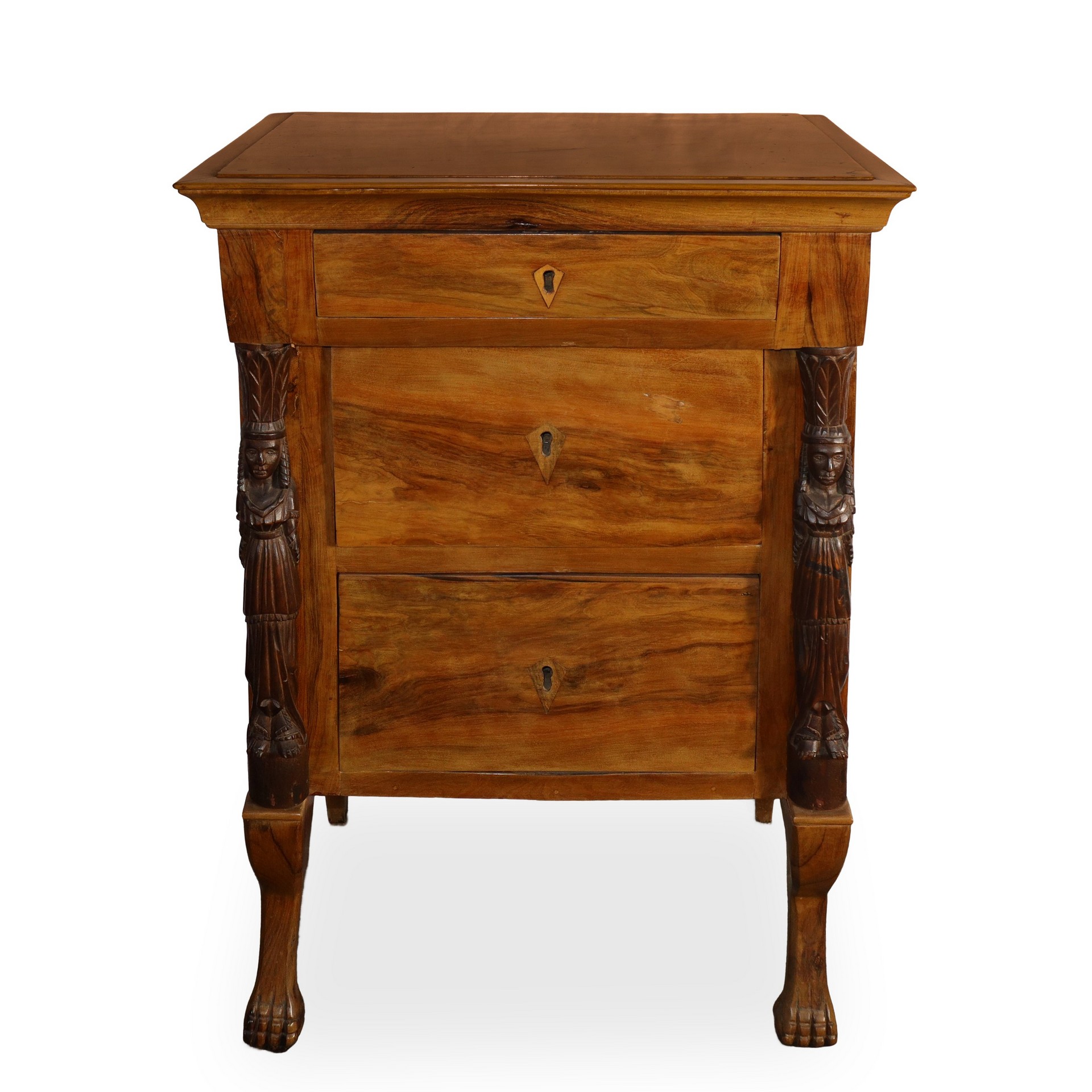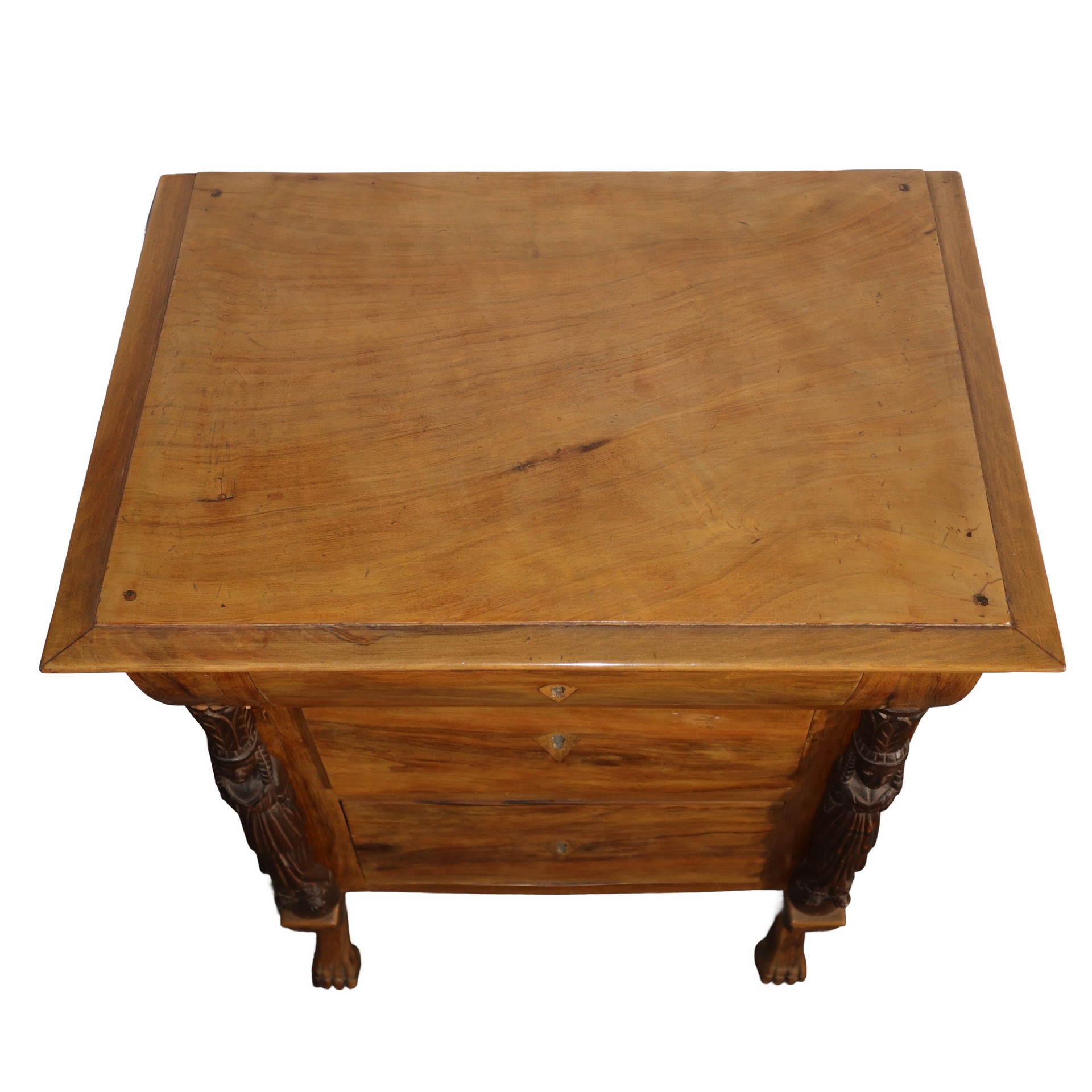 Piccolo cassettone impero 3 cassetti in legno di noce bionda con sfingi scolpite e applicate ai lati e piedi felini, Return to Egypt 19° secolo