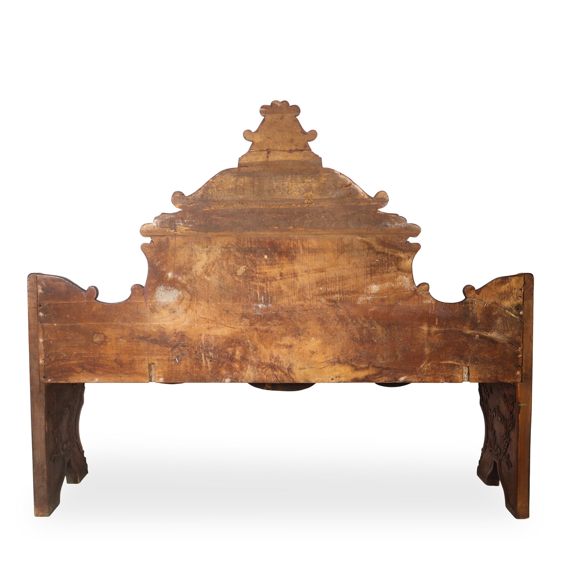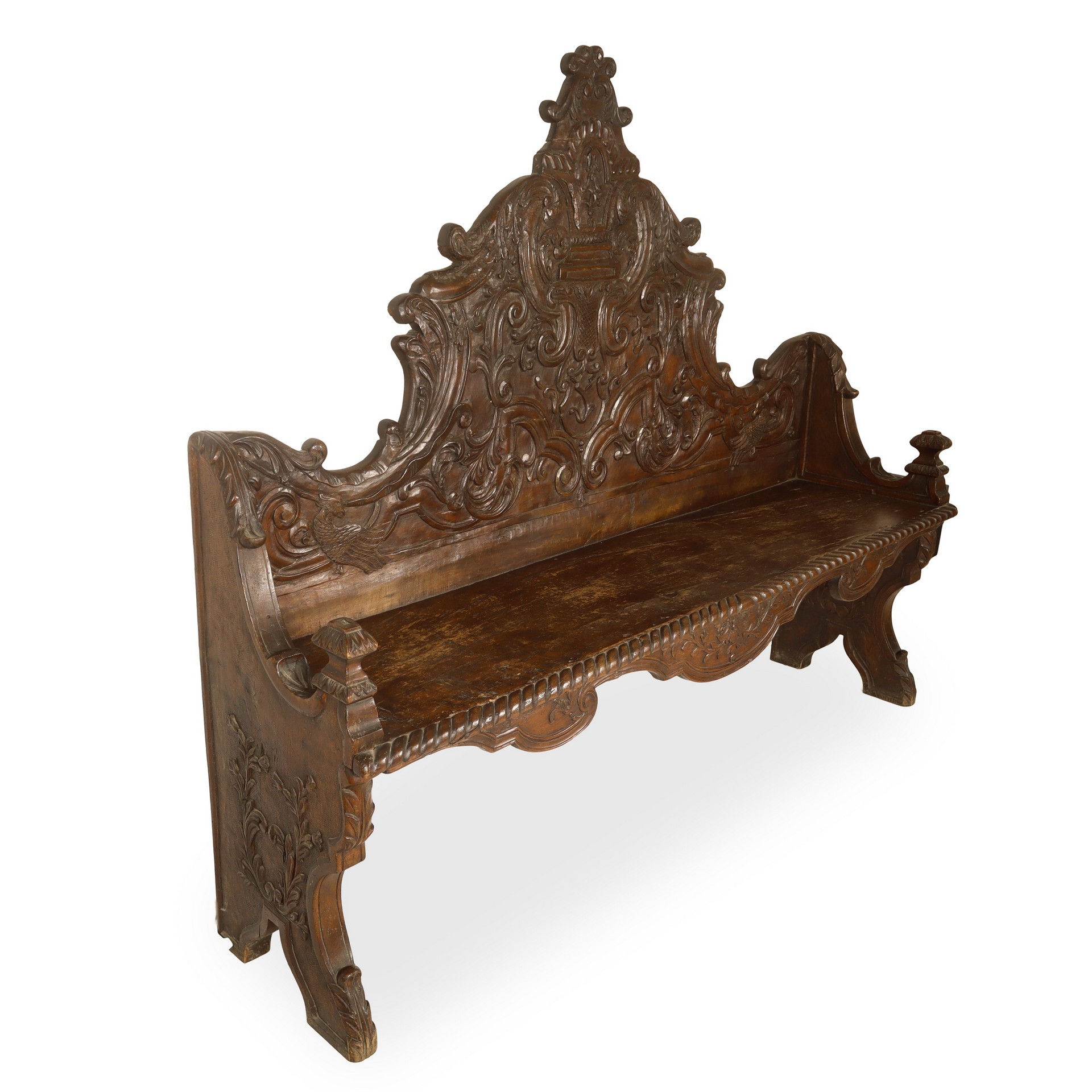 Panca in legno scolpita e intagliata e rifinita sui bordi con motivi a torchon, 18° secolo h cm 130X157X37