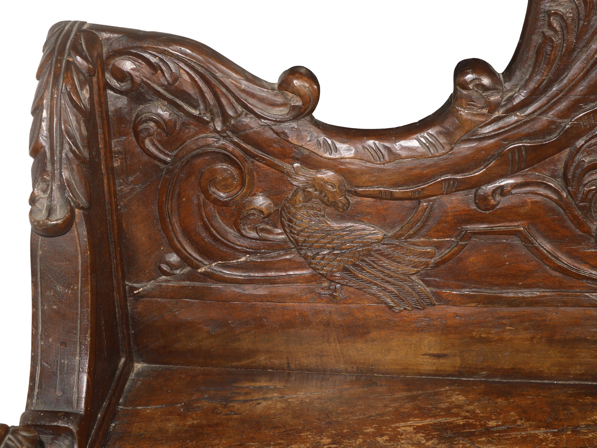 Panca in legno scolpita e intagliata e rifinita sui bordi con motivi a torchon, 18° secolo