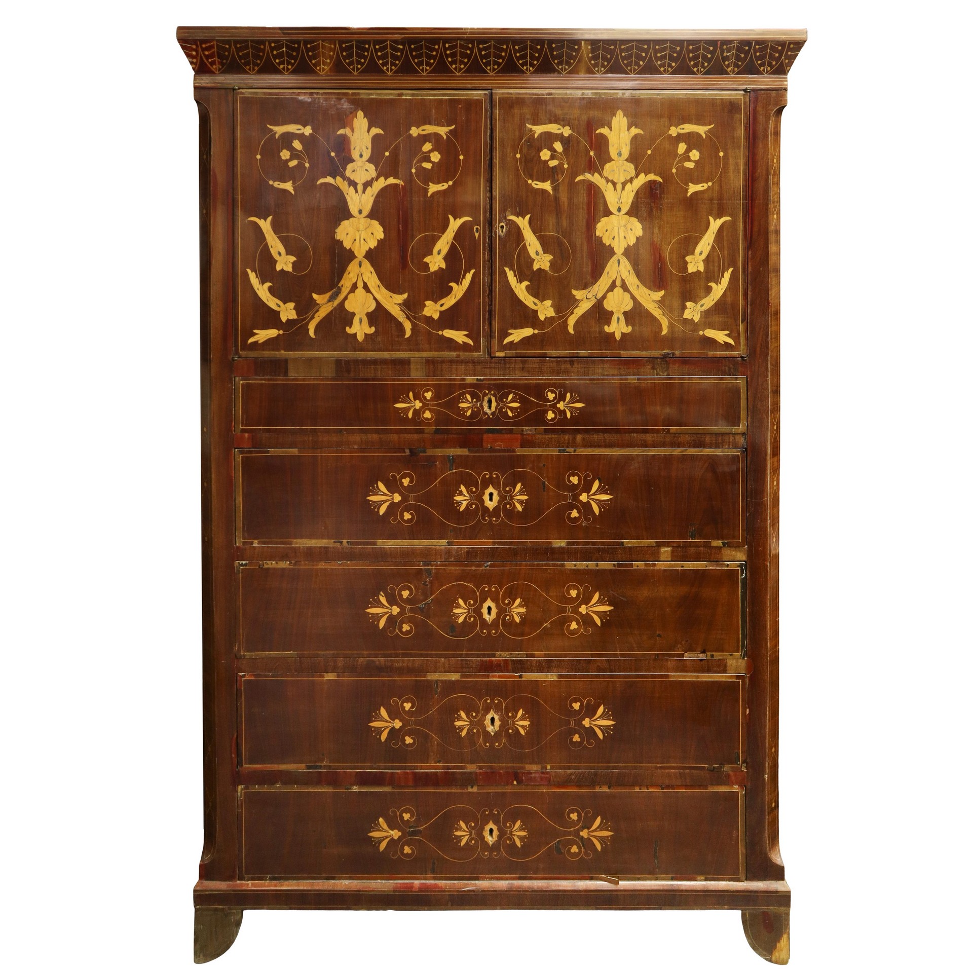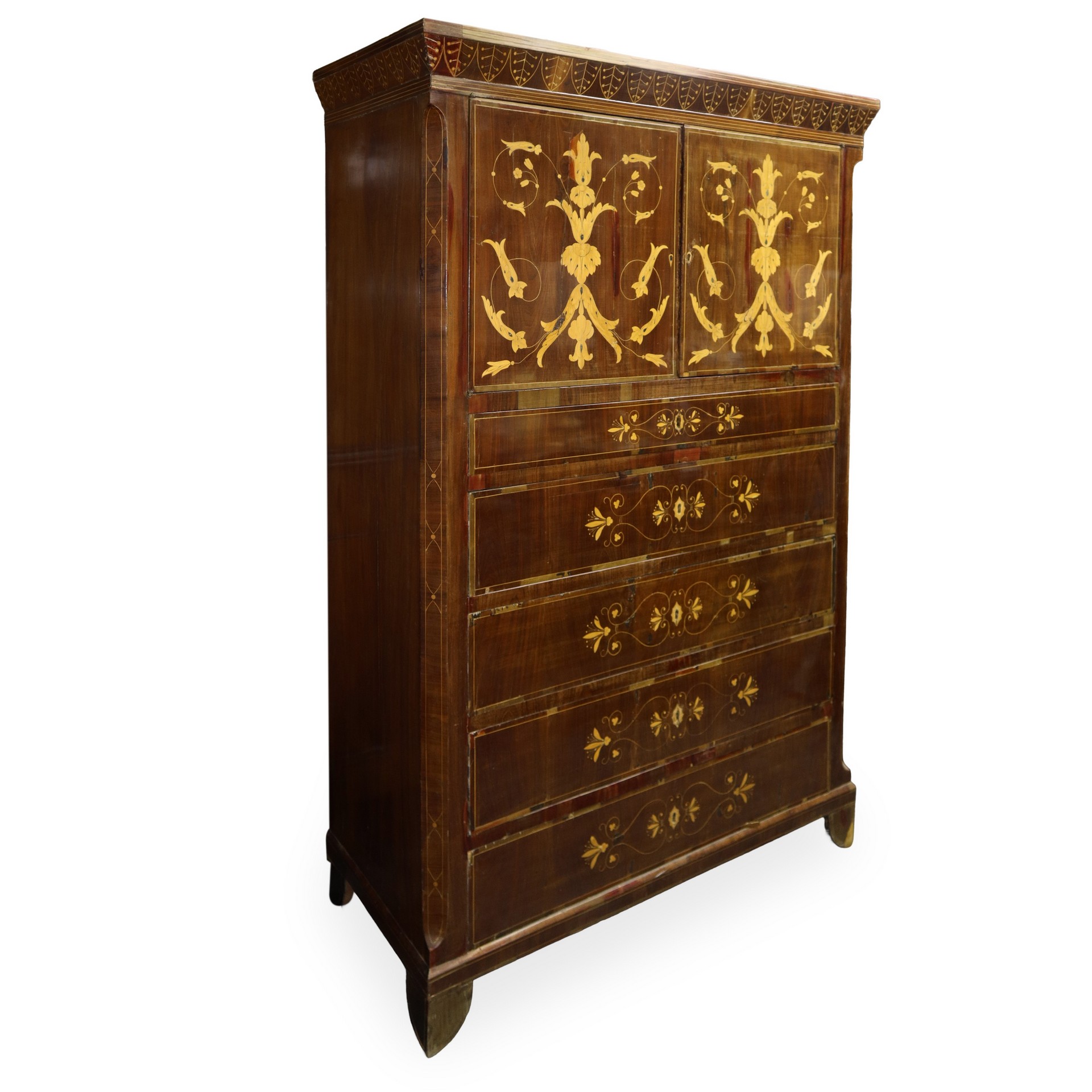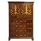 Chiffonier in mogano e piuma di mogano con intarsi in legni chiari a contrasto, due sportelli superiori, 5 cassetti inferiori , Sicily 19° secolo