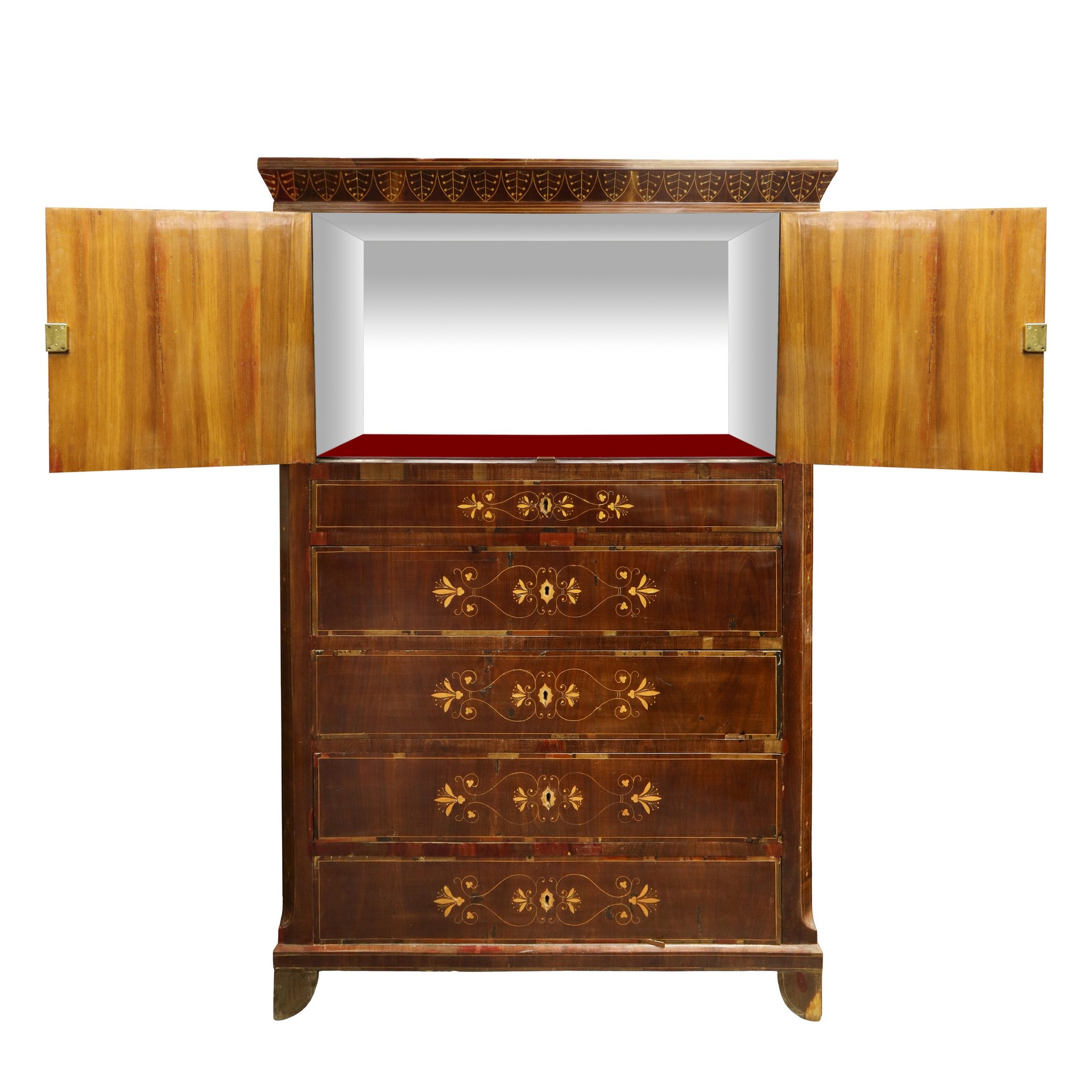 Chiffonier in mogano e piuma di mogano con intarsi in legni chiari a contrasto, due sportelli superiori, 5 cassetti inferiori , Sicily 19° secolo Specchio nella parte superiore interna.Specchio nella parte superiore interna.