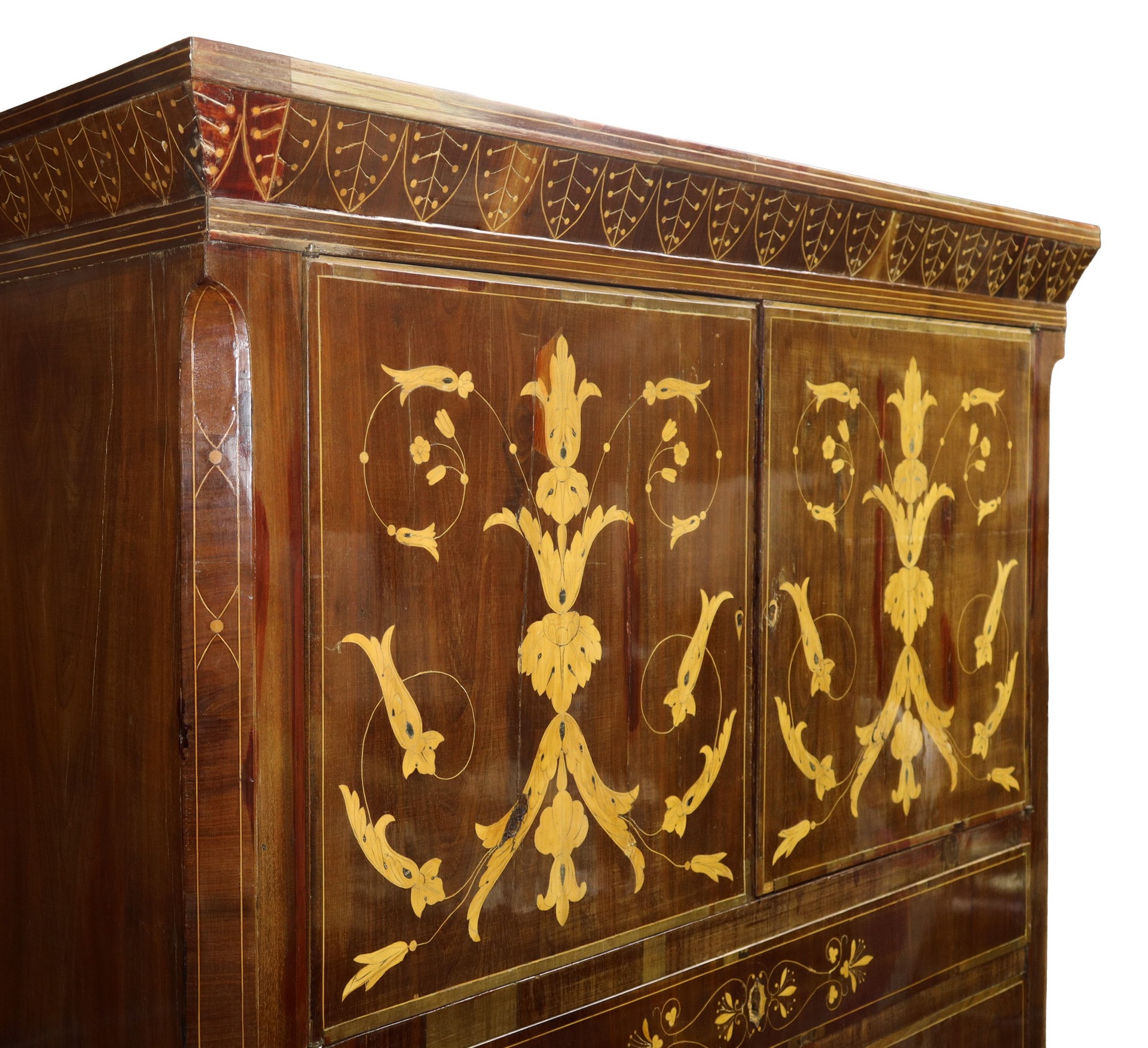 Lot 161 | Chiffonier in mogano e piuma di mogano con intarsi in legni chiari a contrasto, due sportelli superiori, 5 cassetti inferiori , Sicily 19° secolo