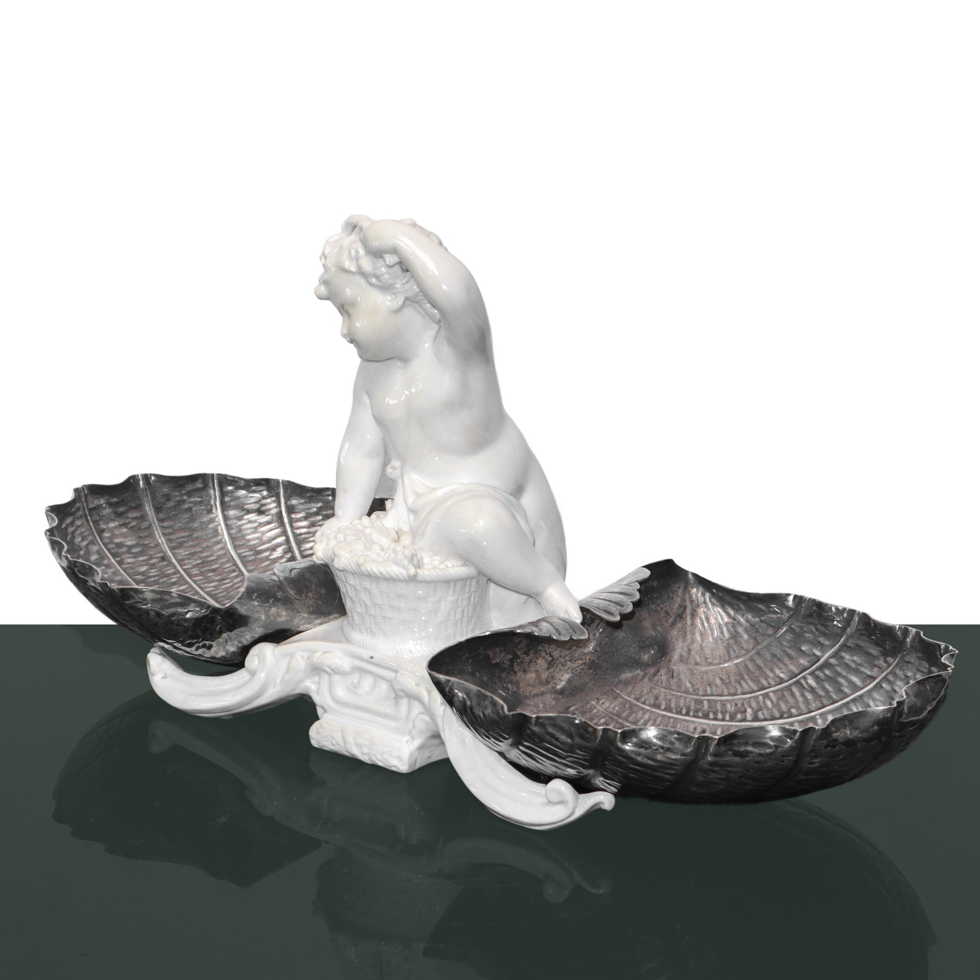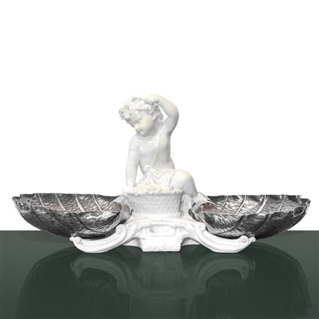 Alzata con putto in porcellana bianca e piatti a guisa di conchiglie in sheffield