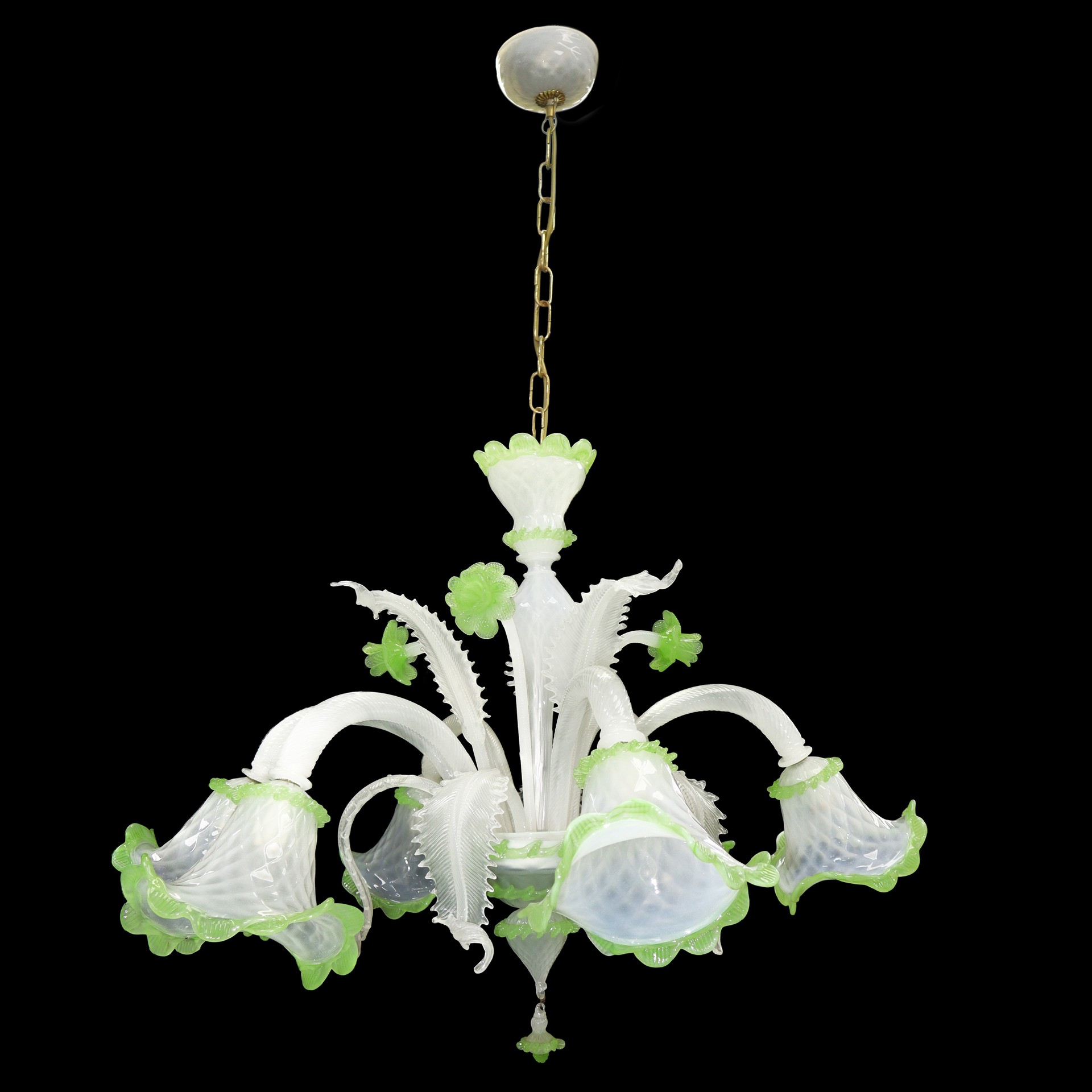 Lampadario in vetro di Murano verde a 6 luci Mancanza su una foglia e una filaturaMancanza su una foglia e una filatura