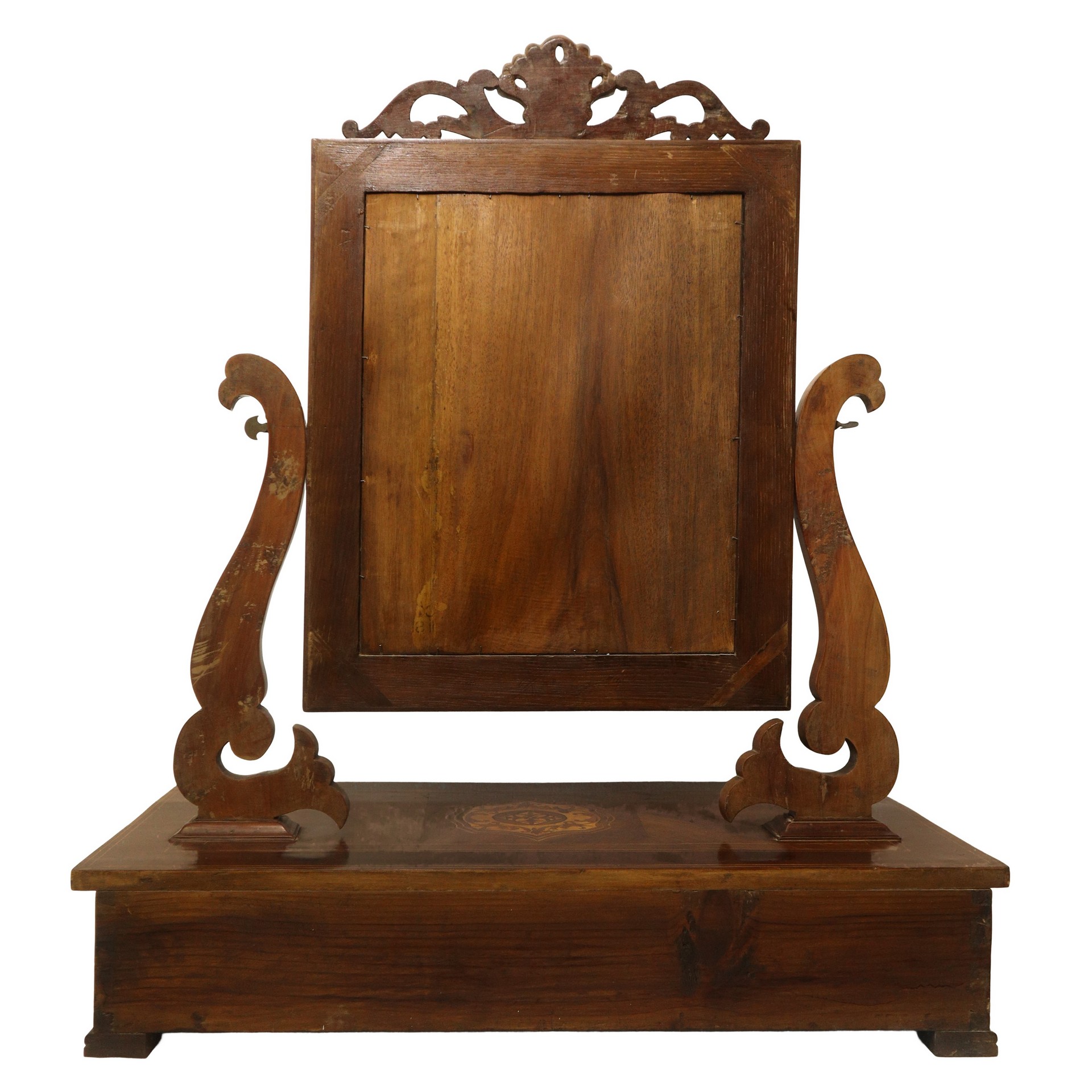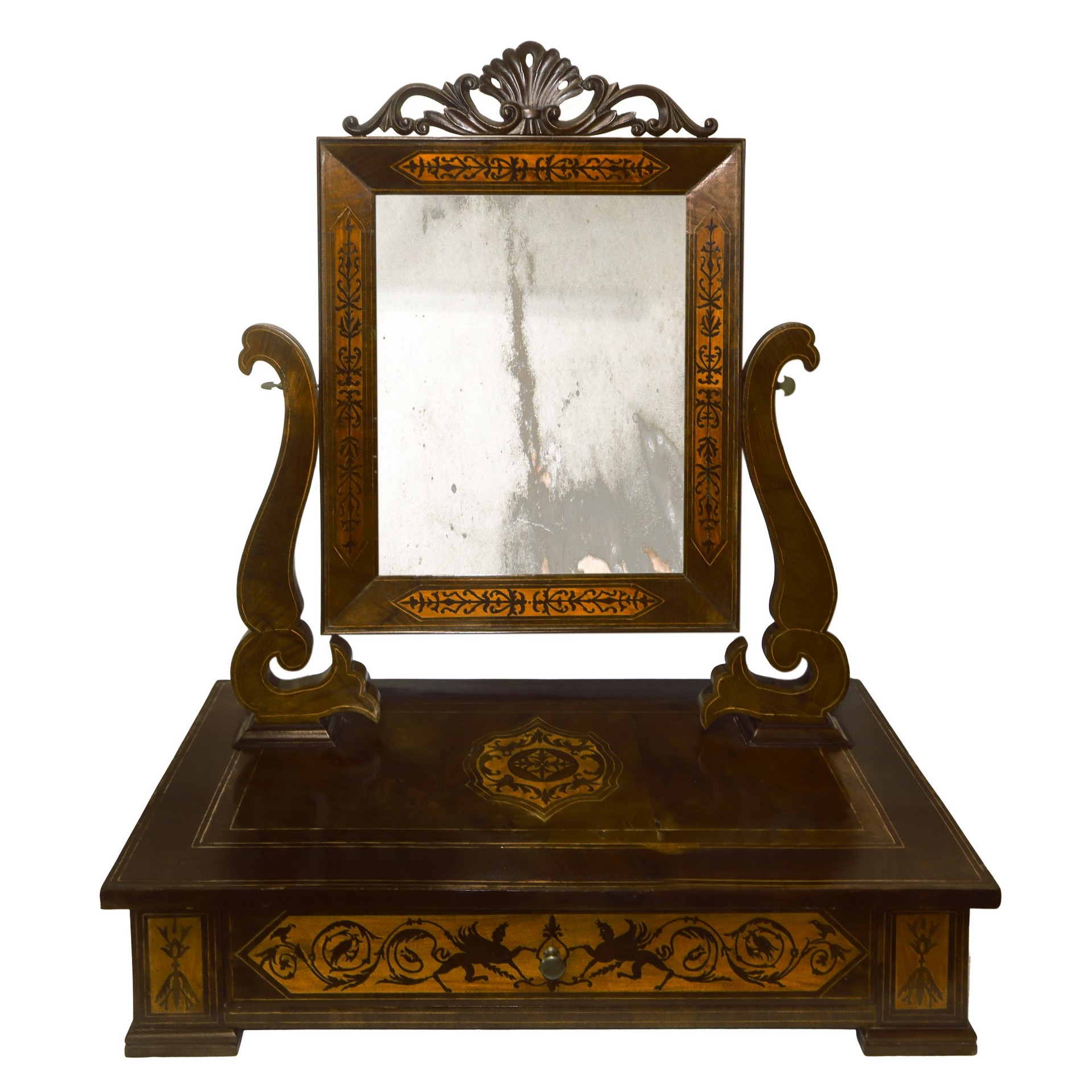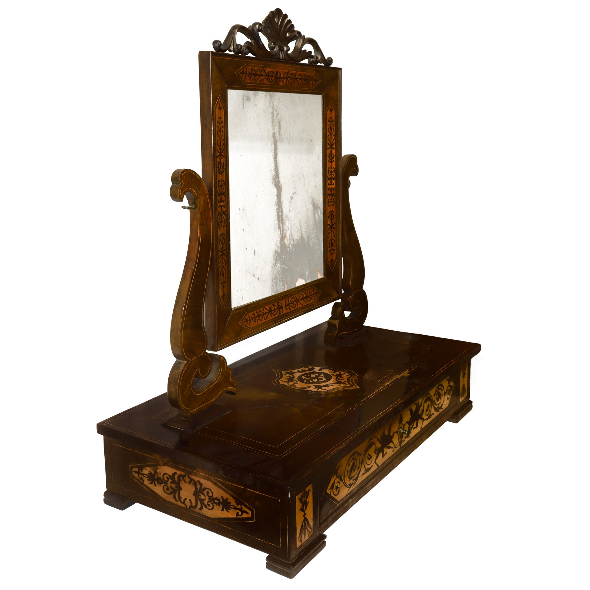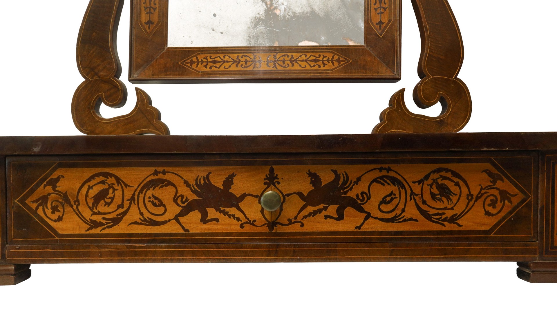 Tolettina in legno e radica di noce e palissandro con intarsi in legno di palissandro e cassetto alla base h cm 90X77X40