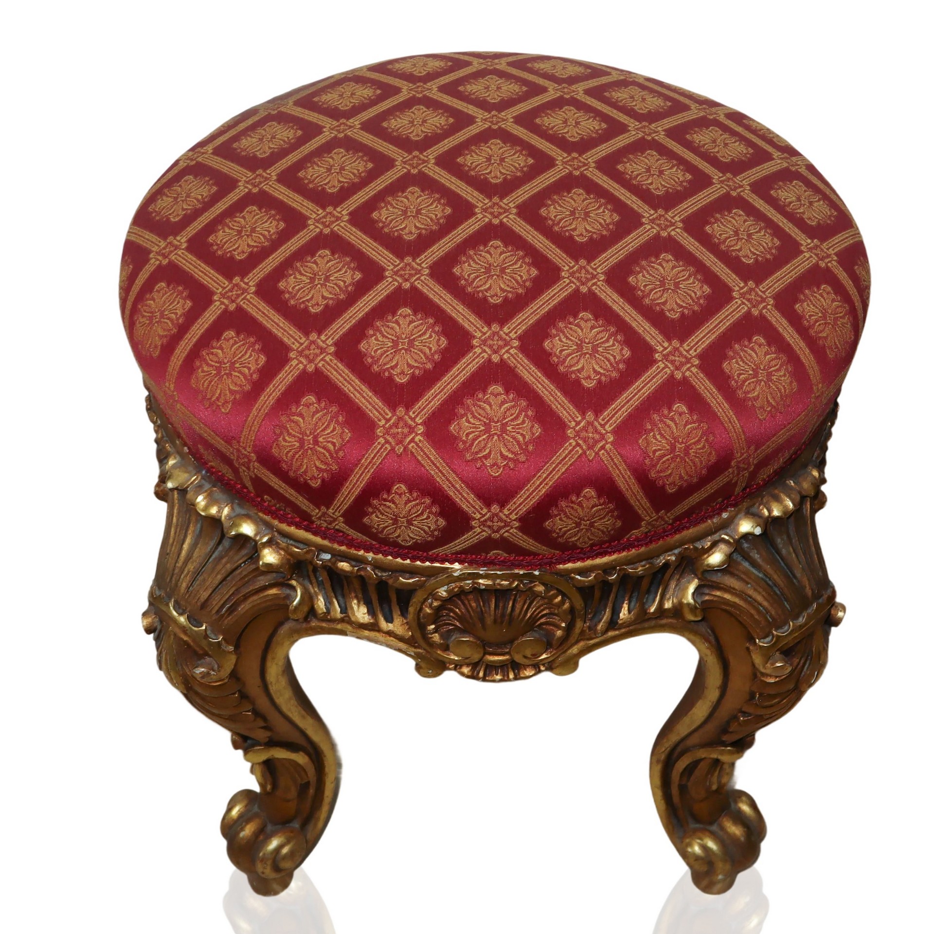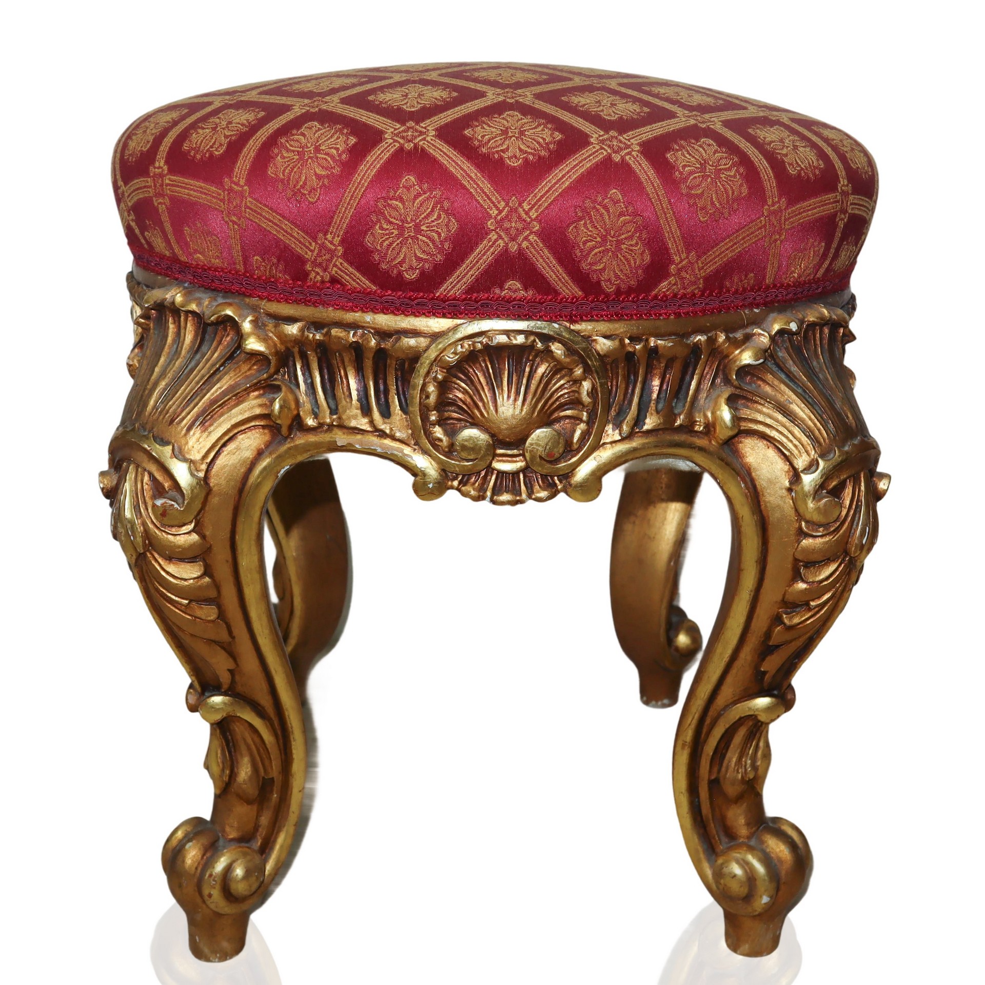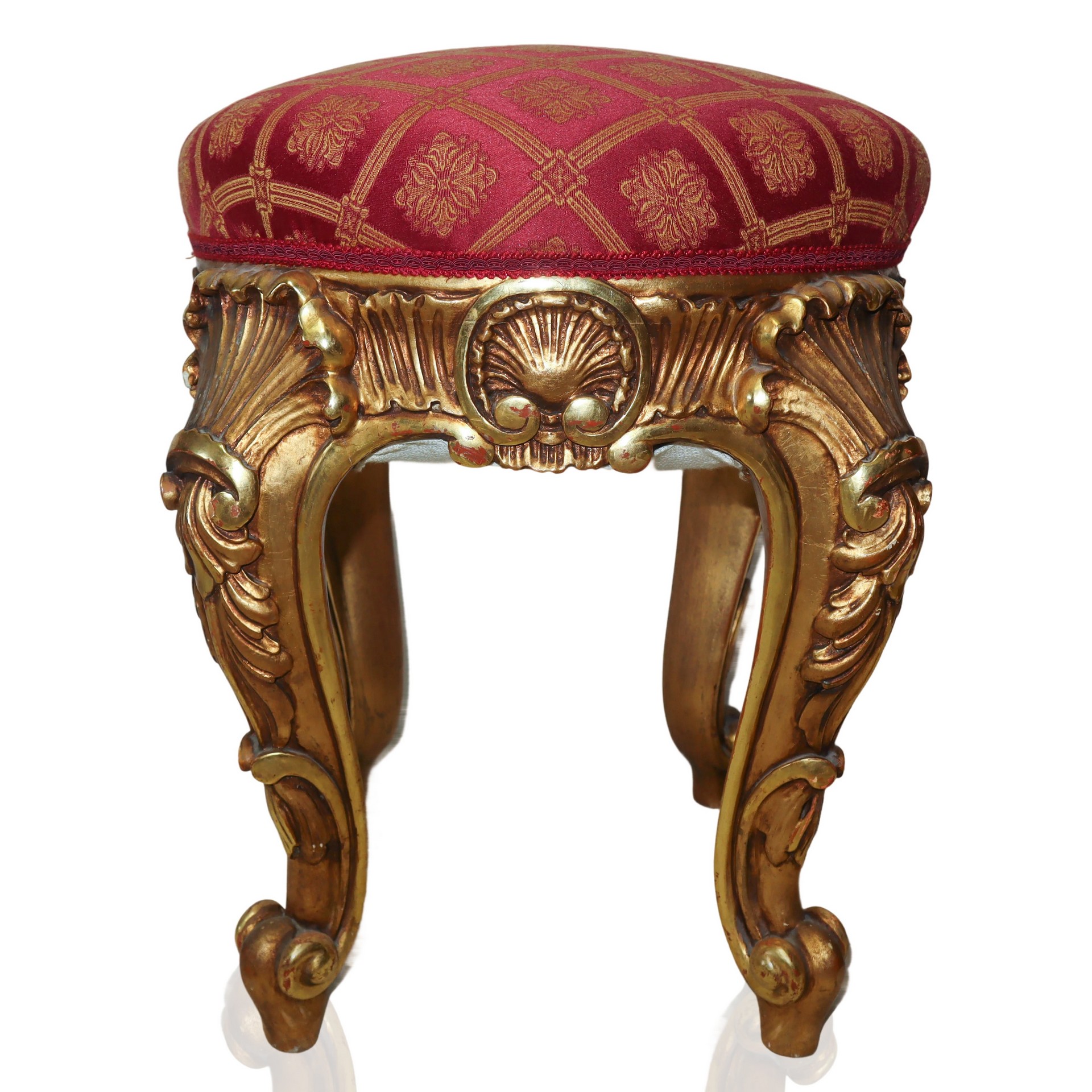Coppia di sgabelli in legno dorato con tappezzeria rossa e dorata, fine 20° secolo h cm 50X40